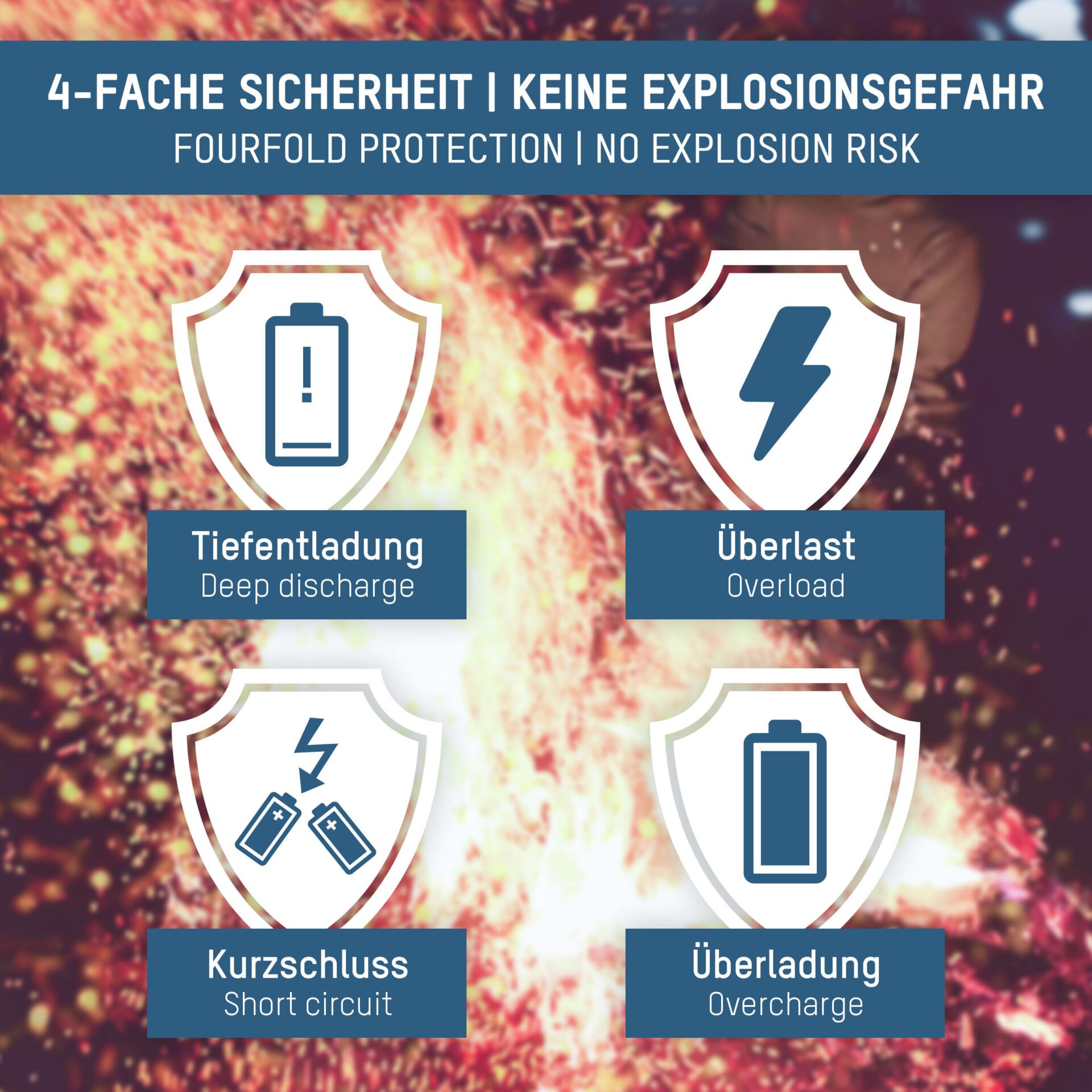 - Integrierte Schutzbeschaltung schützt vor Überladung, Überlast, Kurschluss und Tiefentladung