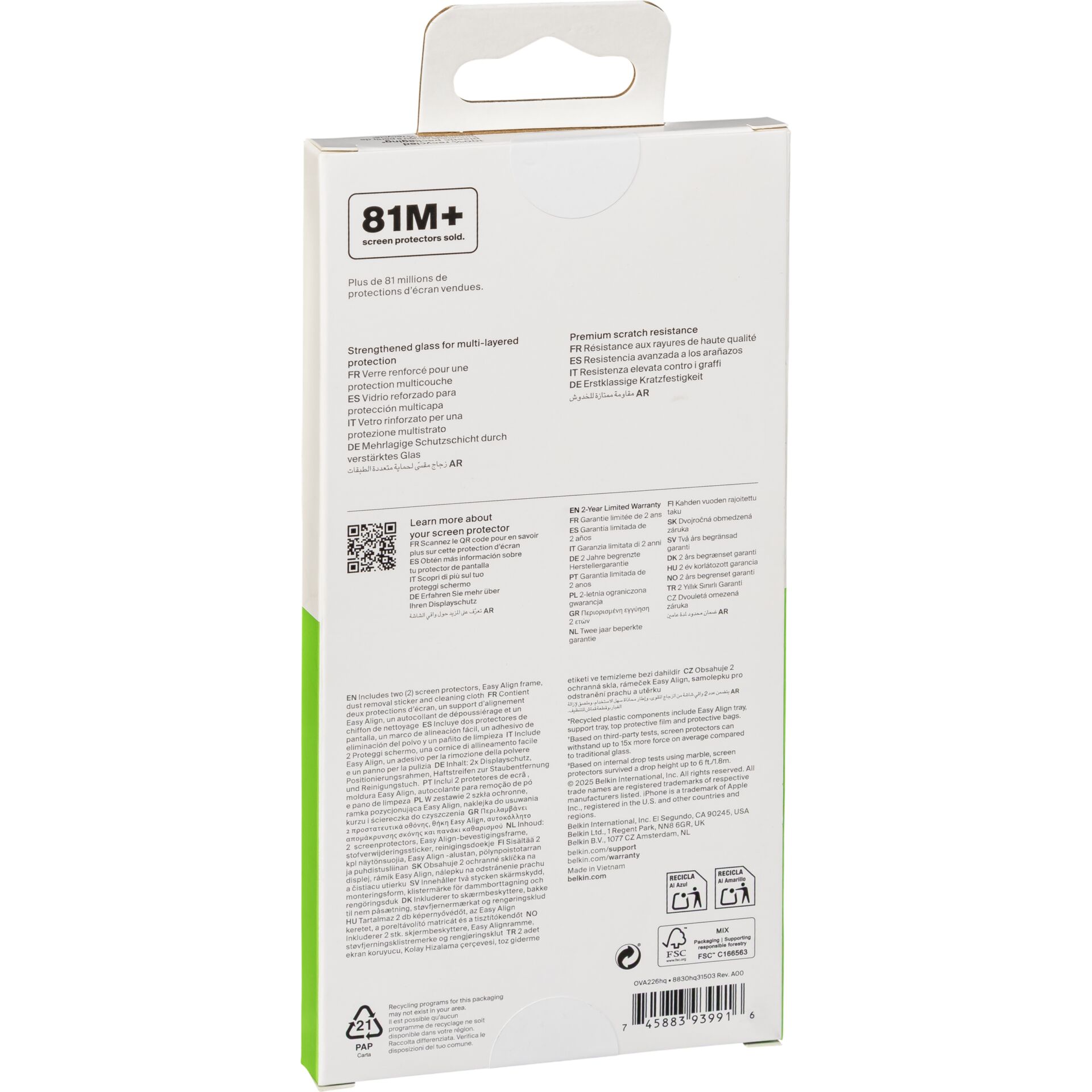 Der Belkin TemperedGlass Displayschutz wurde entwickelt, um den Bildschirm deines iPhone 17 Pro effektiv vor Kratzern, Rissen, Schmutz und Fingerabdrücken zu schützen. Mit einer Stärke von nur 0,33 mm und einer Härte von 9H bleibt die Bedienung des Geräts angenehm und präzise. Die antimikrobielle Beschichtung verhindert zudem Verfärbungen und sorgt für langanhaltende Klarheit. Für eine mühelose, blasenfreie Anbringung ist eine praktische Positionierungsschale im Lieferumfang enthalten.