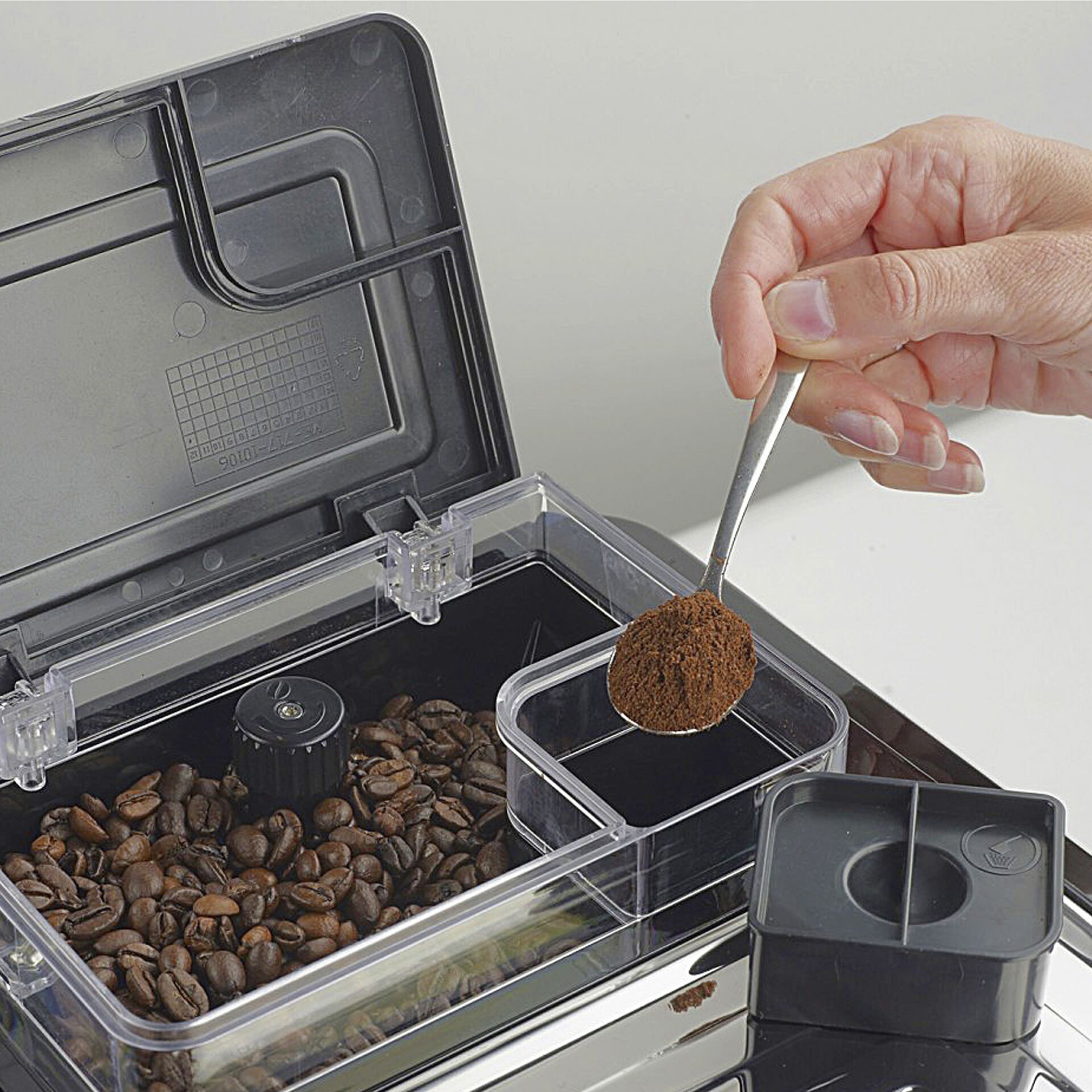 Wollen Sie einmal Kaffeemehl statt Kaffeebohnen verwenden, füllen Sie einfach eine angemessene Menge gemahlenen Kaffees in den dafür vorgesehenen Pulverschacht und wählen auf dem Grafik-Display das dafür vorgesehene Symbol.