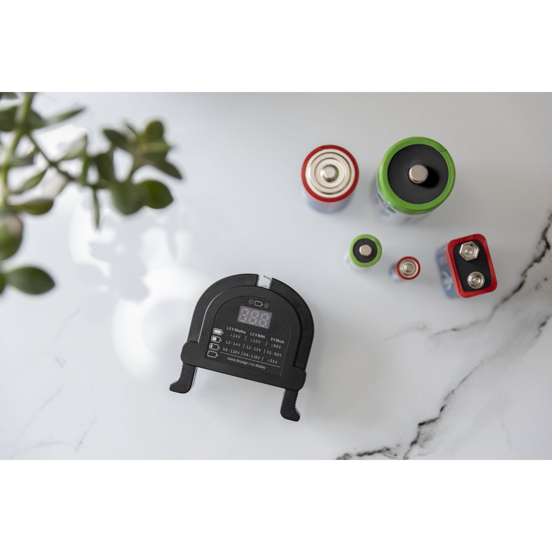 Der handliche Batterietester im Taschenformat funktioniert ohne Batterie oder sonstige Stromzufuhr. Damit ist er jederzeit einsatzbereit, es muss keine Acht auf Stromanschluss oder volle Batterien genommen werden. Er testet Alkaline Batterien, NiMH- und NiCd-Akkus in den Größe Micro AAA, Mignon AA, Baby C, Mono D, 9V-Block E und Knofpzellen zuverlässig und schnell. Auf einer Skala wird der Zustand angezeigt.