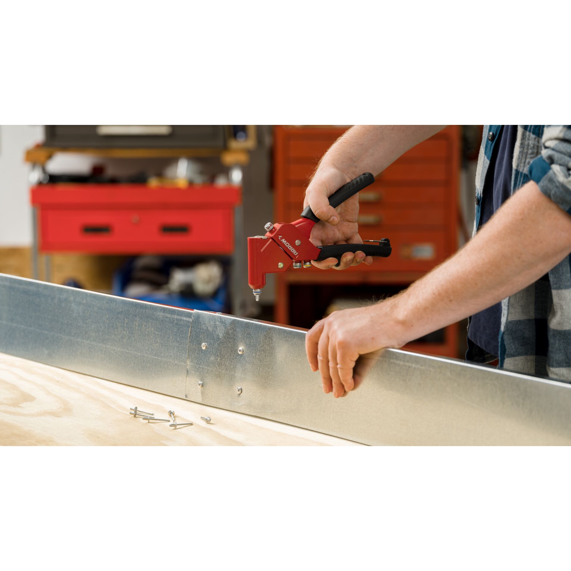 Der schwenkbare Kopf lässt sich vollständig drehen und unterstützt das Arbeiten in verwinkelten Positionen. So können Nieten auch dort gesetzt werden, wo starre Zangen an ihre Grenzen stoßen. Das spart Umpositionierungen und hilft bei gleichmäßigen Arbeitsschritten.