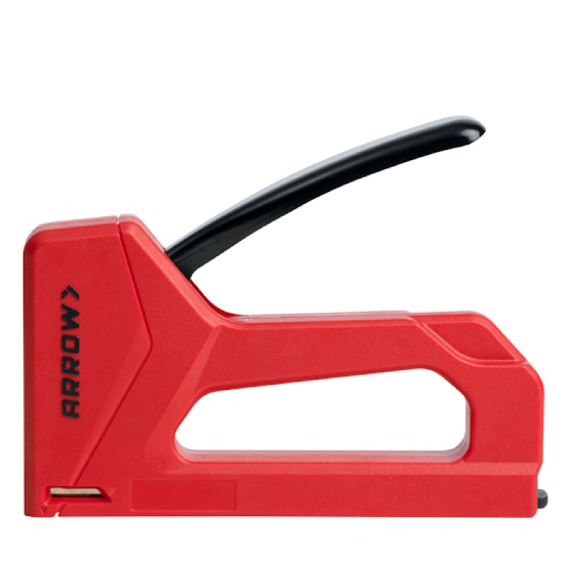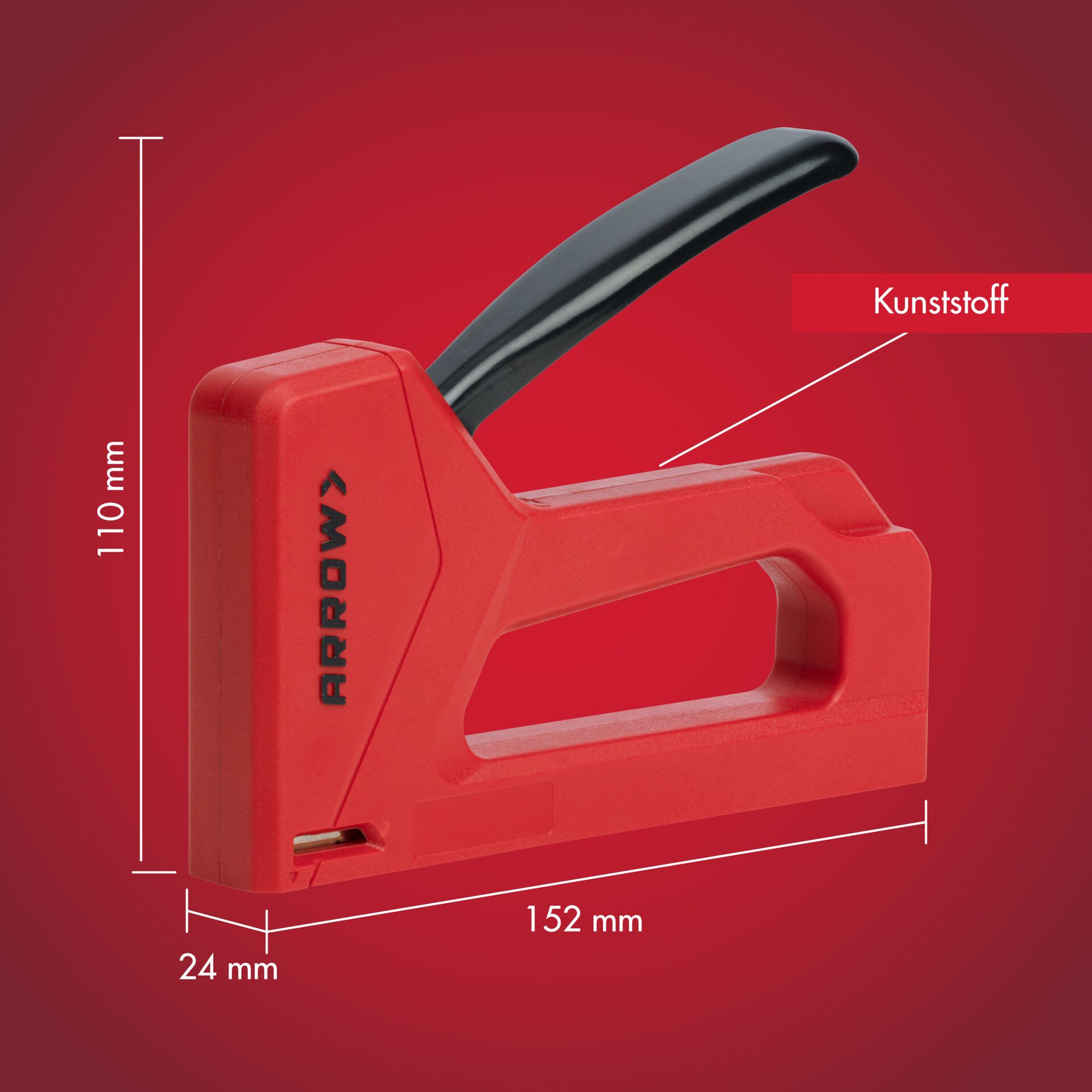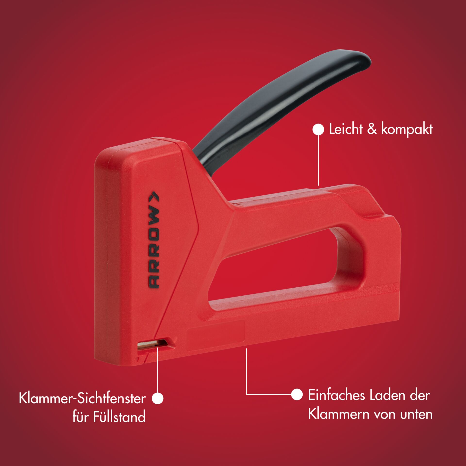 Der Tacker verarbeitet Arrow JT21 Feindrahtklammern mit Längen von 6 bis 10 mm. Das Vorwärtsdesign reduziert Rückschläge beim Tackern und unterstützt gleichmäßige Ergebnisse. Der Stahlhebel überträgt die Kraft zuverlässig auf das Material.