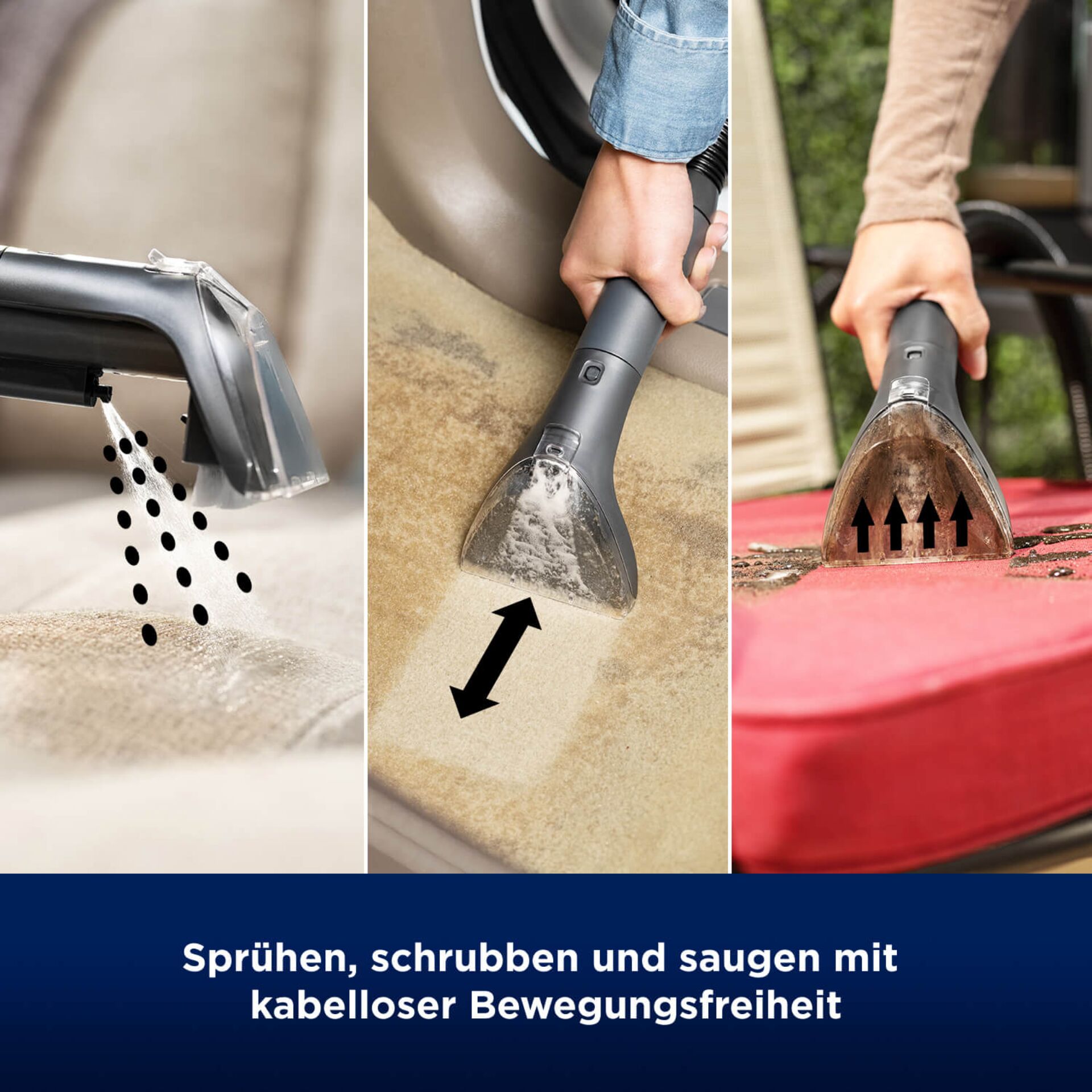 Dreifach wirkendes, mobiles Reinigungssystem. Schluss mit hartnäckigen Flecken durch Sprühen, Schrubben und Saugen.