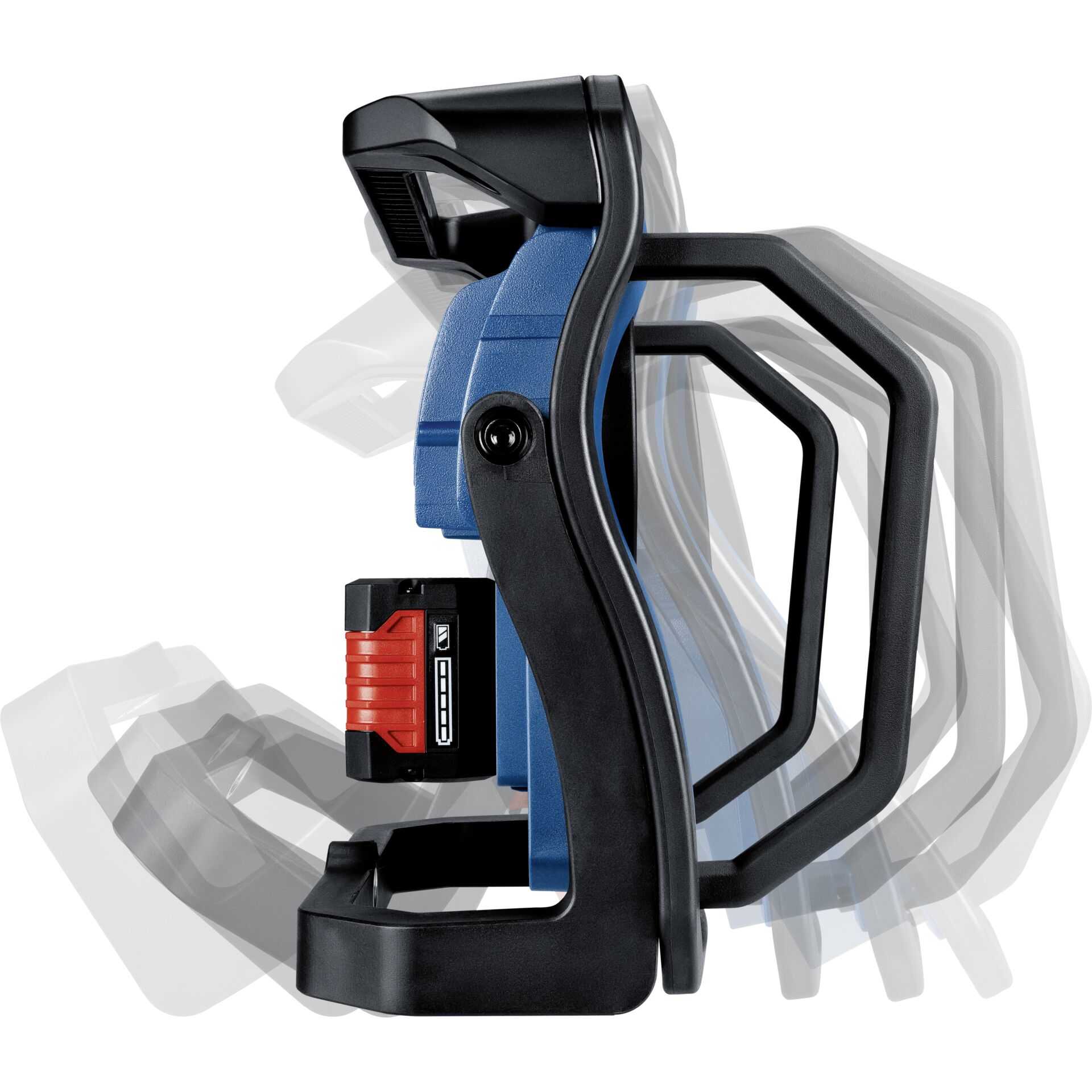 Die GLI 18V-4000 C Professional ist eine hell leuchtende, robuste Lampe aus dem 18V-Sortiment. Ihre leistungsstarke LED ist in der Lage, für eine exzellente Ausleuchtung bis zu 4.000 Lumen zu sorgen. Die Lampe ist aufgrund ihres massiven Metallkörpers, der durch einen stoßdämpfenden Gummirahmen und stabile Sicherheitsbügel abgeschirmt ist, extrem robust. Sie verfügt über ein User Interface mit einer Helligkeits- und Ladezustandsanzeige als auch über ein Bluetooth Connectivity-Modul, das eine bequeme Fernsteuerung sowie Beleuchtungseinstellungen über die Kachel MyTools in der Toolbox App ermöglicht. Sie hat drei Helligkeitsstufen, flexible Einstellwinkel und ein 5/8"-Stativgewinde, was eine schnelle Anpassung an jede Arbeitssituation ermöglicht. Diese Lampe eignet sich hervorragend zum Ausleuchten ganzer Arbeitsbereiche. Das Gerät ist kompatibel mit allen Bosch Professional 18V-Akkus und -Ladegeräten (Professional 18V System).