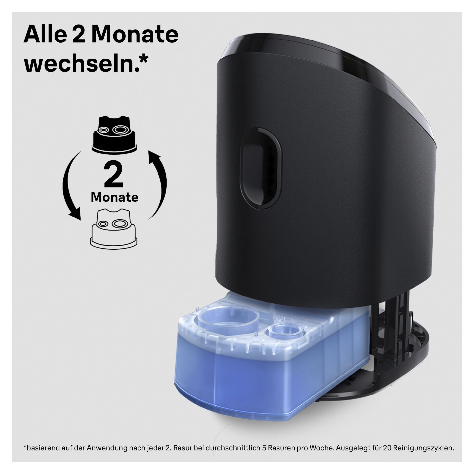 Braun Clean & Renew Reinigungskartuschen gewährleisten, dass Ihr elektrischer Rasierer stets frisch und gepflegt ist. Die alkoholbasierte Reinigungslösung reinigt gründlicher als Wasser und beseitigt Haare sowie Hautpartikel, die sich während des Rasierens ansammeln. Zudem pflegen Hochleistungsschmiermittel die Rasierklingen und minimieren Reibung, um mögliche Hautirritationen zu reduzieren.