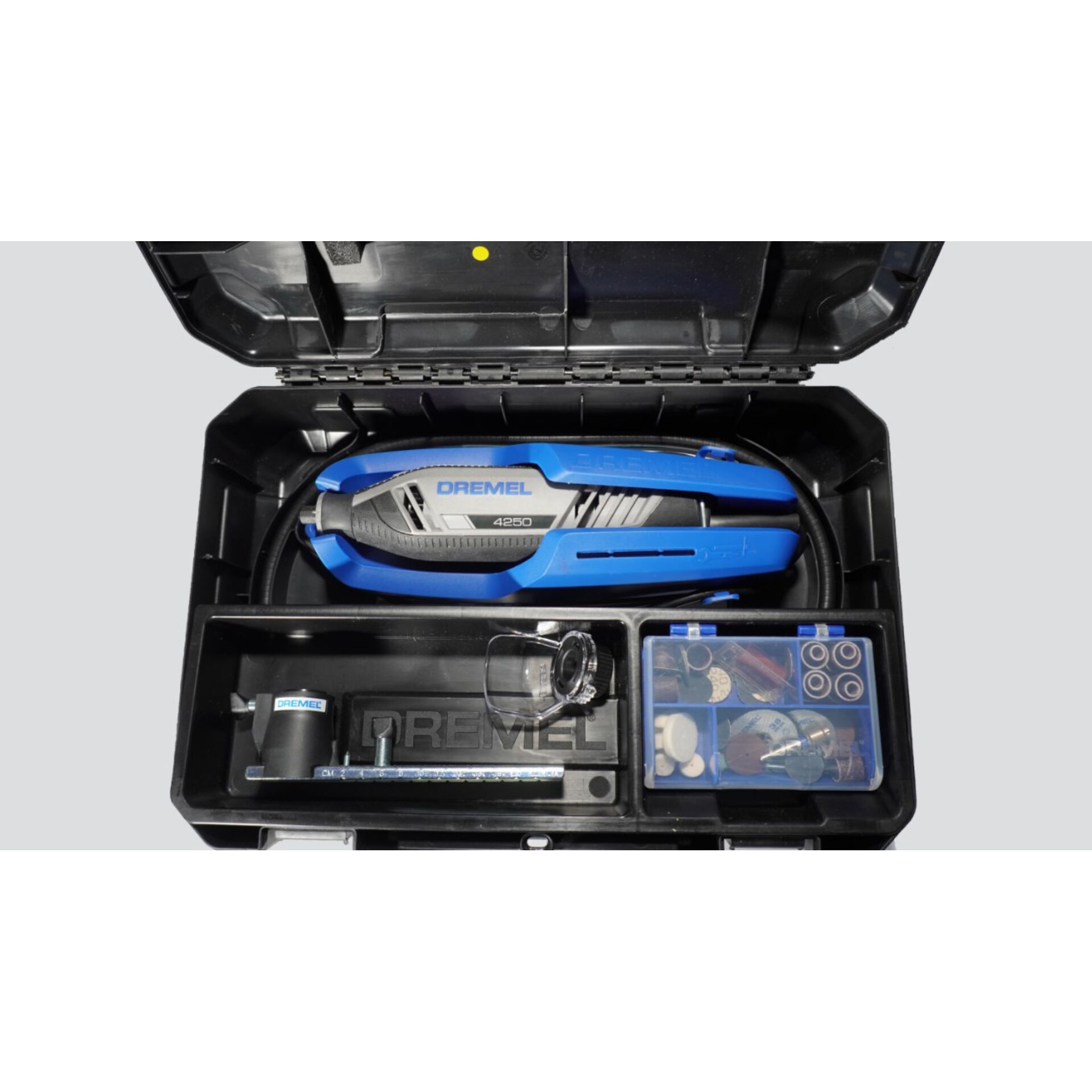 Der Dremel 4250 ist ein leistungsstarkes, kabelgebundenes Multifunktionswerkzeug mit einem umfangreichen 45-teiligen Zubehör-Set in einem stabilen Transportkoffer.