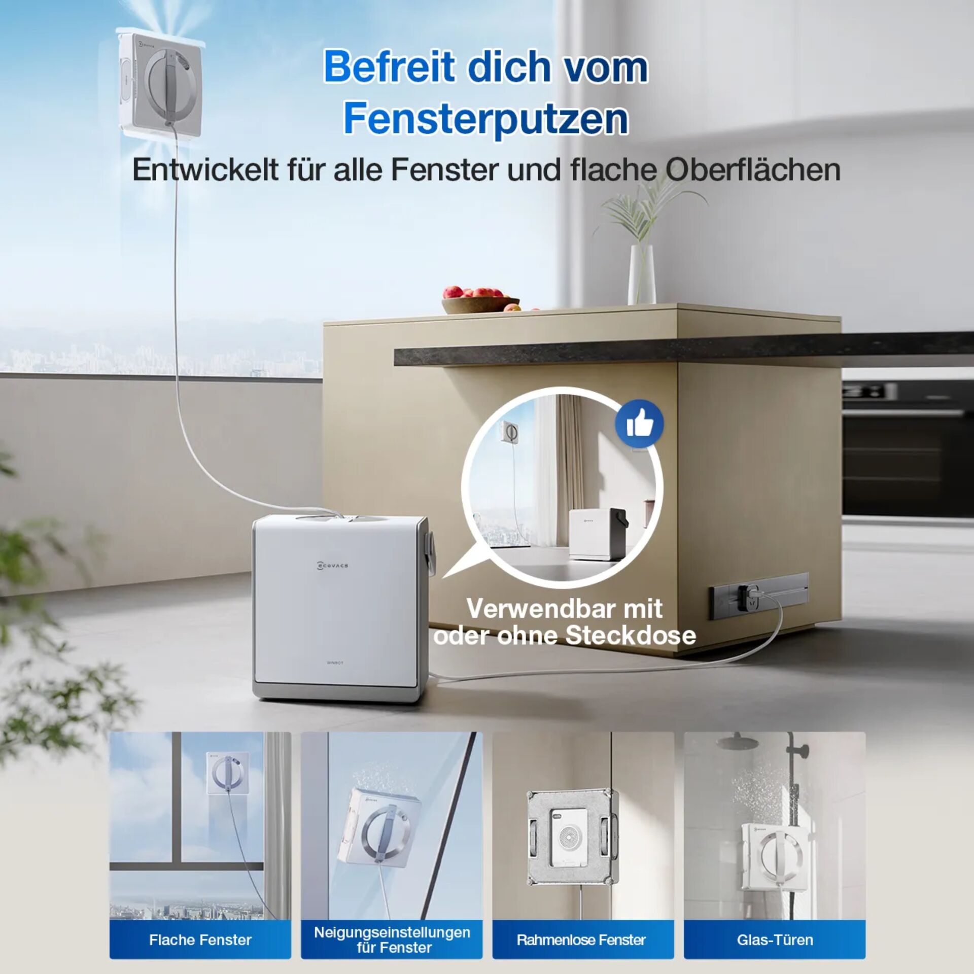Die Bedienung ist komfortabel und flexibel: Über die mitgelieferte Multifunktionsstation kannst du den Reinigungsmodus wählen, die Reinigung starten oder pausieren und zum Startpunkt zurückkehren – alles mit einem Knopfdruck. Nach getaner Arbeit sorgt das automatische Aufwickeln des Kombi-Sicherheits- und Stromkabels für Ordnung. Damit ist der WINBOT W2 PRO OMNI ein durchdachtes Komplettpaket für saubere Fenster – mit minimalem Aufwand für dich.