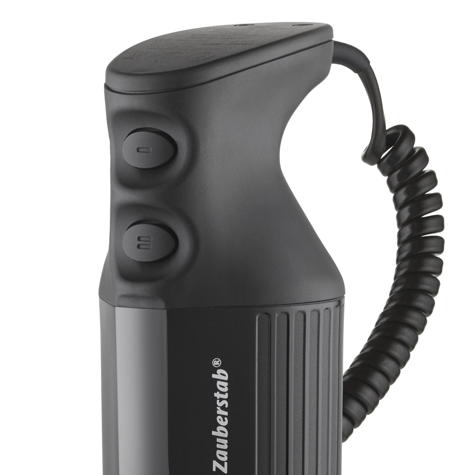 Per Soft-Touch-Membranschalter stehen zwei Geschwindigkeitsstufen zur Auswahl: 12.000 U/min und 17.000 U/min. Das circa 60 cm lange Spiralkabel ist bis zu 150 cm ausziehbar und sorgt so für Bewegungsfreiheit bei der Zubereitung.