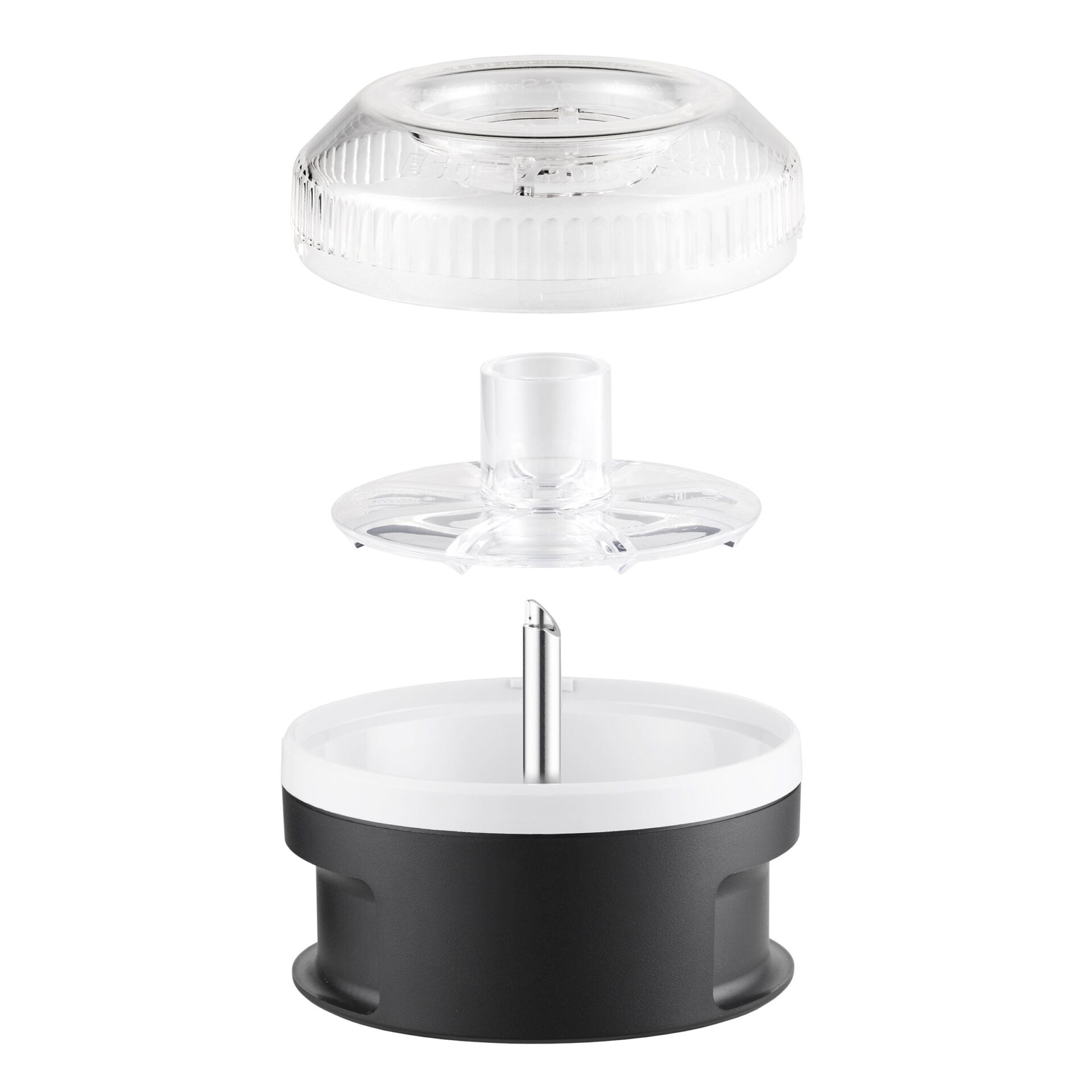 Die Pulverscheibe gewährleistet das optimale Verarbeiten kleinerer Mengen. Ein zweiteiliges Becher-Set mit dichtschließenden Deckeln und das exklusive Rezeptbooklet sowie die Bedienungsanleitung mit Rezepten runden das praktische Paket ab.