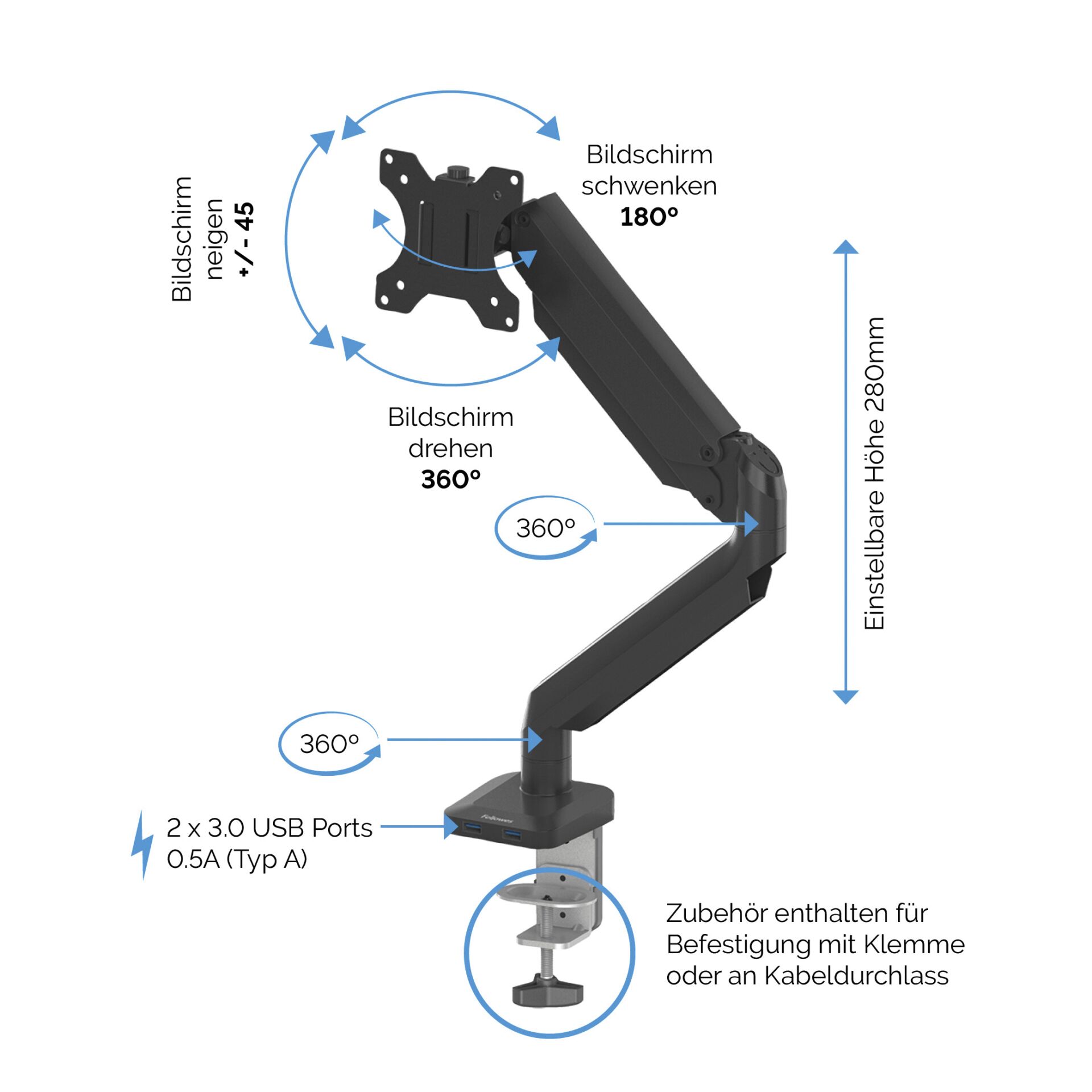 - Voll verstellbarer Arm mit Gasfeder-Technologie ermöglicht eine gemeinsame Bildschirmnutzung und kollaboratives Arbeiten