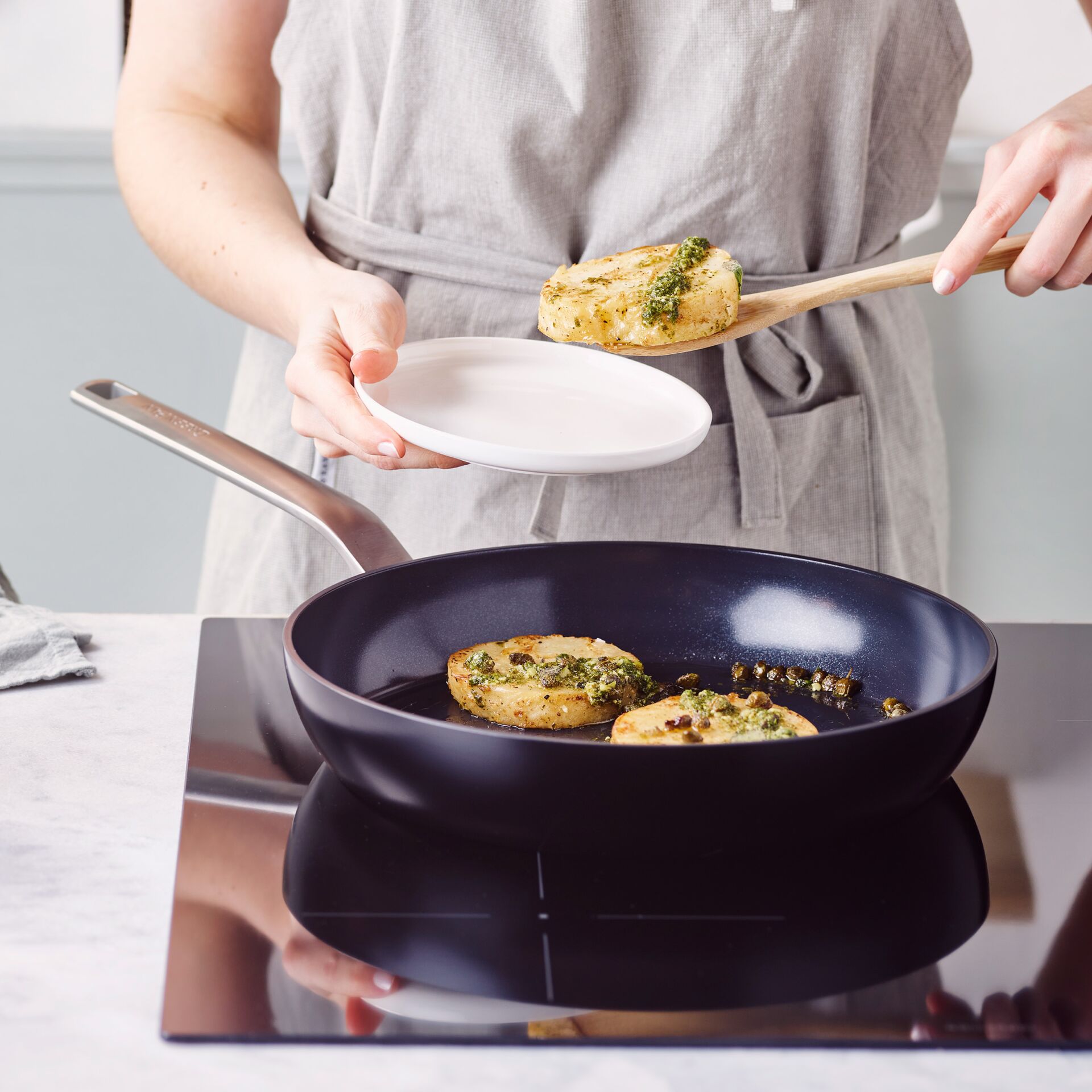 Die Bodenstruktur passt sich der Temperatur an und hilft dabei, die Pfanne plan auf dem Kochfeld zu halten. So gelingen Dir Bratvorgänge gleichmäßig, auch wenn Du häufig zwischen verschiedenen Herdarten wechselst. Der Griff liegt sicher in der Hand und unterstützt präzises Schwenken.