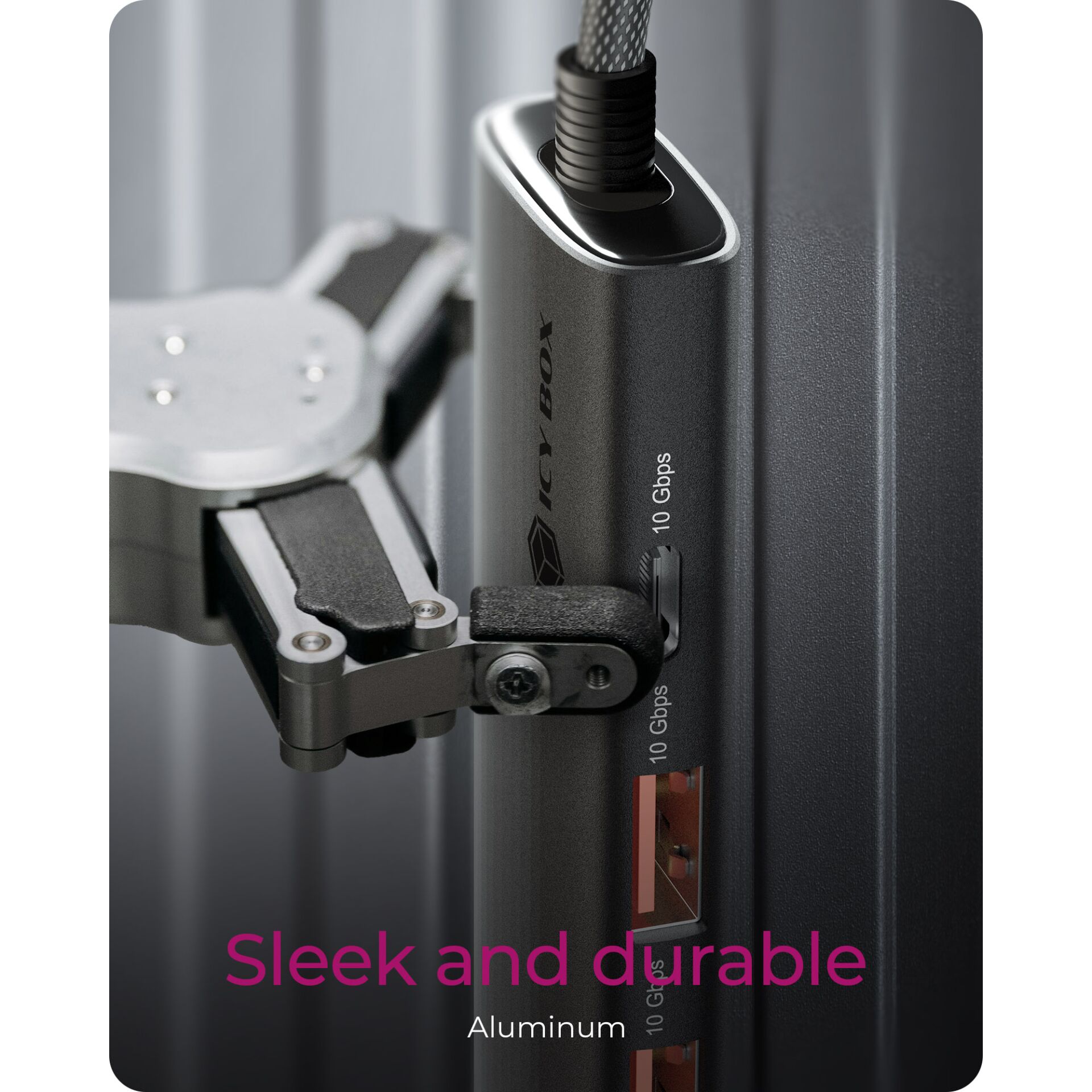Der IB-HUB1437-CPD verfügt über ein integriertes geflochtenes Kabel, das weitere Kabel überflüssig macht. Dieses kompakte Design sorgt für Ordnung am Arbeitsplatz und minimiert das Kabelgewirr. Es eignet sich perfekt für Reisen und den täglichen Gebrauch und ermöglicht eine schnelle und unkomplizierte Verbindung, so dass die Einrichtung überall einfach ist.