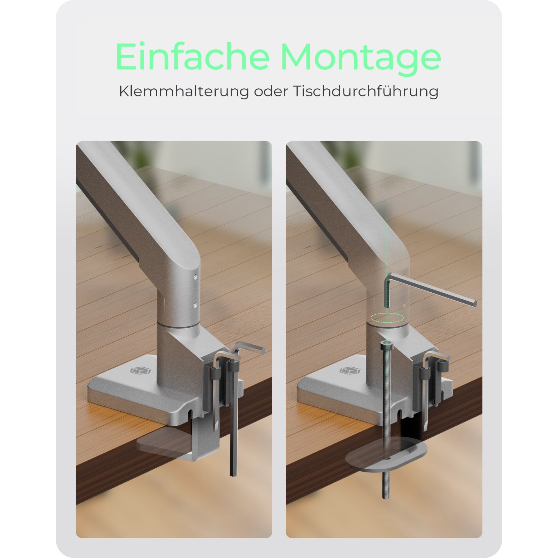 - Befestigung mit Klemmen und Tüllen: Wählen Sie zwischen Klemmbefestigung oder Tischdurchführung für eine schnelle Einrichtung direkt von der Schreibtischoberfläche aus