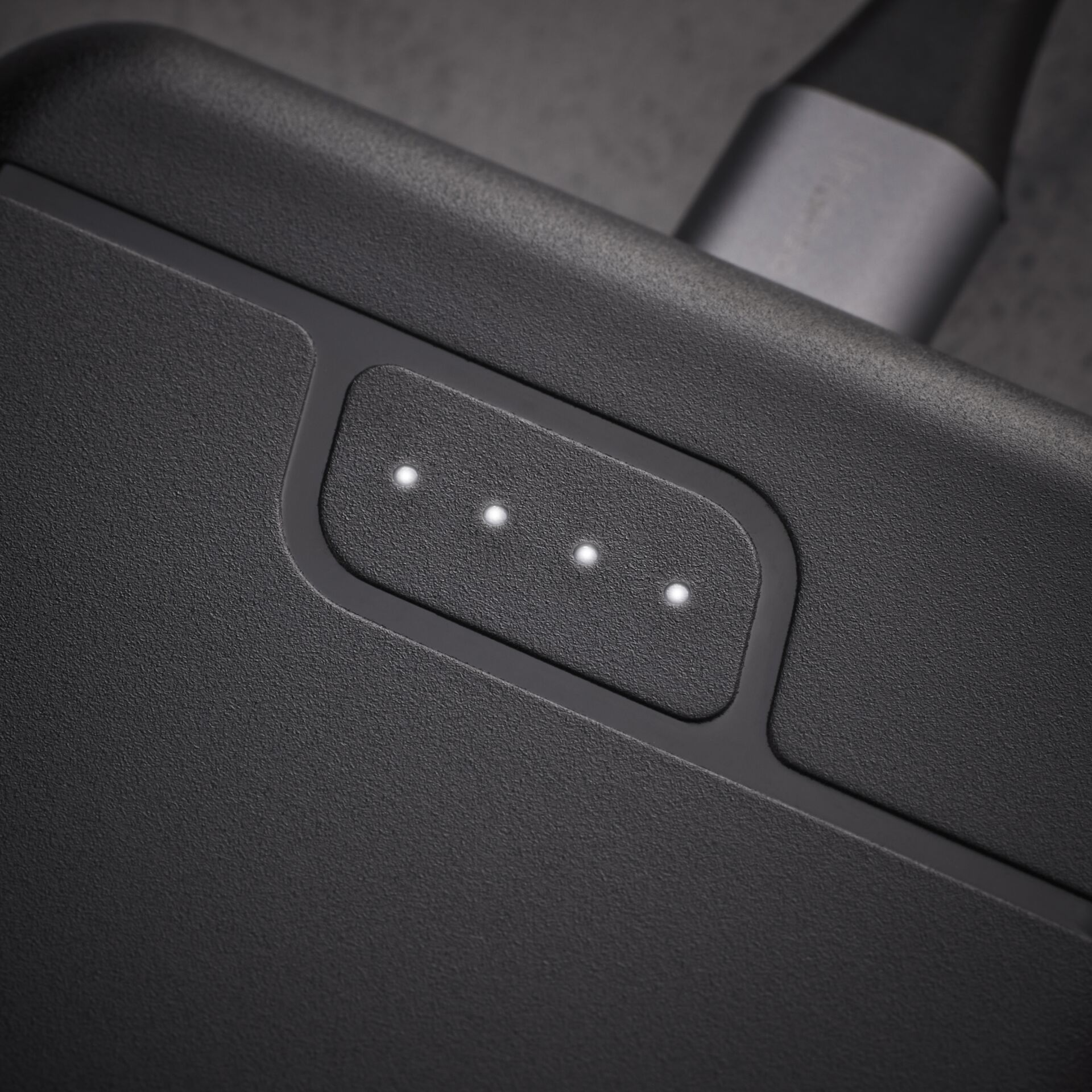 Ausgestattet mit einem Lithium-Polymer-Akku bietet die Powerbank mehrere Ladeoptionen. Ein USB-C-Anschluss dient sowohl als Ein- als auch Ausgang, ergänzt durch zwei USB-A-Ausgänge. So lassen sich mehrere Geräte gleichzeitig mit bis zu 2,4 Ampere versorgen. Vier Status-LEDs zeigen den aktuellen Ladezustand an.