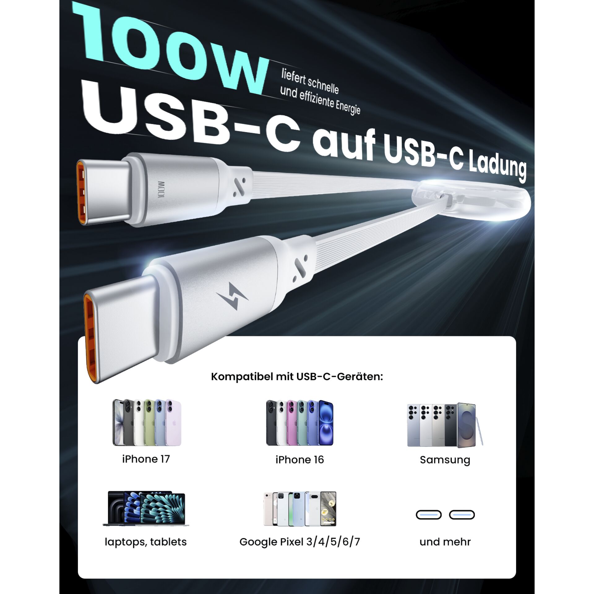 - Kompatibel mit USB-C-Geräten wie Laptops, Smartphones, Tablets und USB-C-Netzadaptern
