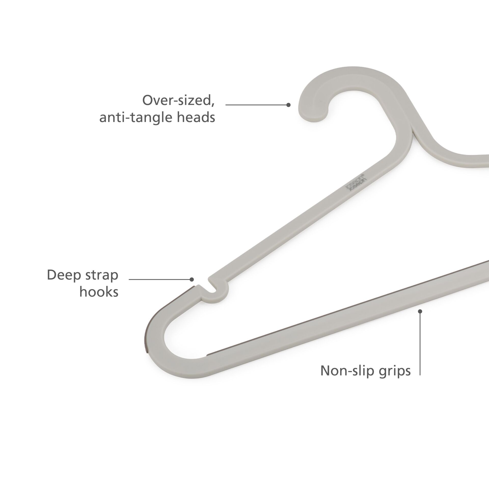 Das Joseph Joseph Orderly Set mit fünf Kleiderbügeln sorgt für eine ordentliche und platzsparende Aufbewahrung von Kleidung. Dank der rutschfesten Oberfläche bleiben Hemden, Hosen und Röcke sicher an ihrem Platz, ohne zu verrutschen. Die extra großen Haken verhindern ein Verheddern auf der Kleiderstange und erleichtern das Aufhängen und Entnehmen der Kleidung.