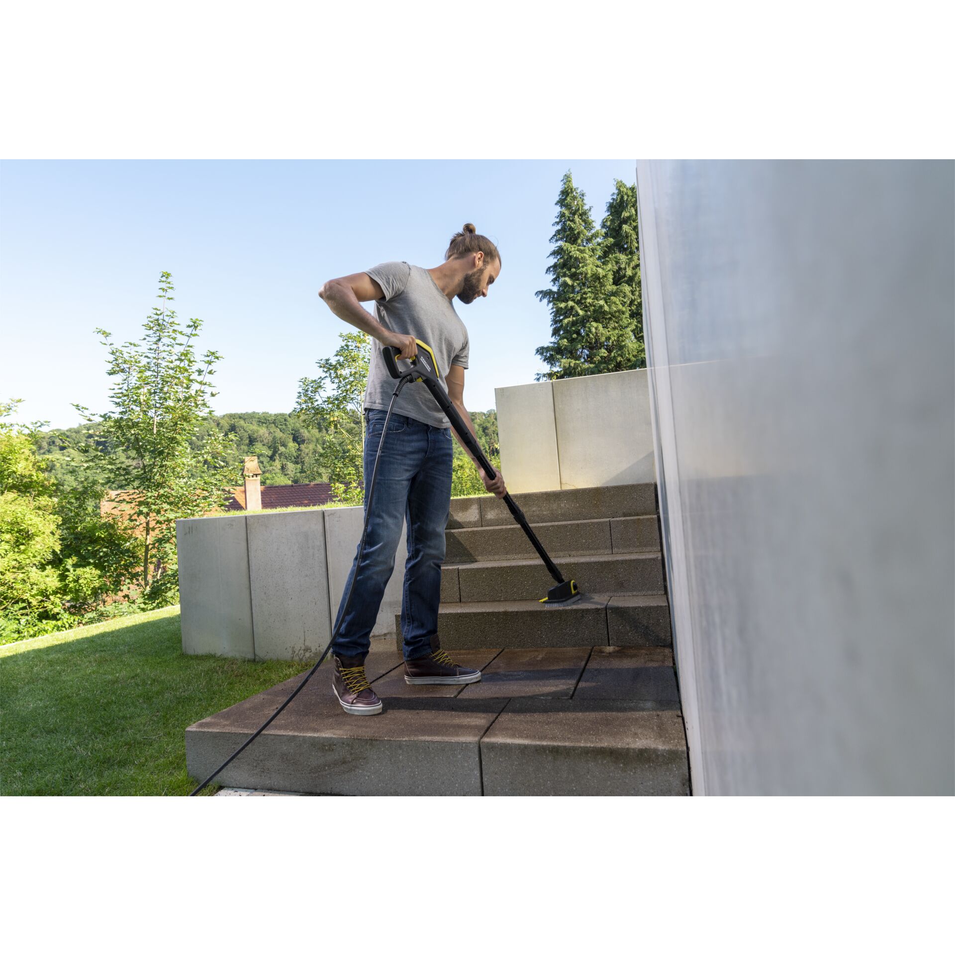 Der Powerschrubber PS 30 sorgt für strahlende Reinigungsergebnisse auf verschiedensten Oberflächen. Dafür sorgen 3 Hochdruckdüsen, die auch hartnäckigen Schmutz lösen. Damit ist der PS 30 der optimale Helfer für die zuverlässige Reinigung von kleinen bis mittelgroßen Flächen, wie für Treppen und Kanten. Um an schwer zugängliche Stellen zu gelangen, kann der Bürstenkopf um 360° gedreht werden. Alle glatten Flächen können nach der Reinigung mit der integrierten Schmutzlippe abgezogen werden. So wird überflüssiges Schmutzwasser schnell entfernt und die Flächen sind direkt wieder nutzbar. Diese Kombination aus Hochdruckstrahl und manuellem Bürstendruck stellt mit seiner Reinigungsleistung jeden herkömmlichen Schrubber in die Ecke und kann mit allen Kärcher Hochdruckreinigern der Klassen K 2 bis K 7 kombiniert werden.