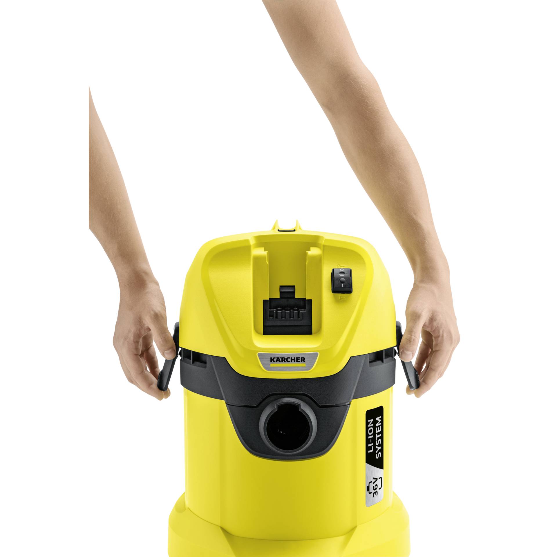 Der WD 3 Battery saugt so stark wie ein Mehrzwecksauger mit Kabel, braucht aber keinen Stromanschluss. Die Akkulaufzeit beträgt je nach Akku 15 bis 30 Minuten (Akku nicht im Lieferumfang enthalten). Der flexible Mehrzwecksauger verfügt zudem über einen robusten und stoßfesten Kunststoffbehälter mit 17 Liter Fassungsvermögen sowie einen Patronenfilter zum bequemen Aufsaugen von trockenem und nassem Schmutz ohne Filterwechsel. Der strömungsoptimierte Saugschlauch und die clevere Clips-Bodendüse mit Mischeinsatz tragen entscheidend zu einer optimalen Schmutzaufnahme bei und sorgen für restlose Sauberkeit. Praktisch ist auch der abnehmbare Handgriff, der die Zubehöranbringung direkt am Saugschlauch ermöglicht. Bei Arbeitsunterbrechungen können Saugrohr und Bodendüse dank Parkposition bequem zwischengeparkt werden. Zusätzliche Extras wie die Blasfunktion, das „Pull ’n’ Push“-Verschlusssystem, der ergonomische Tragegriff und die äußerst praktische Zubehöraufbewahrung machen die Arbeit mit dem WD 3 Battery zum reinsten Vergnügen.
