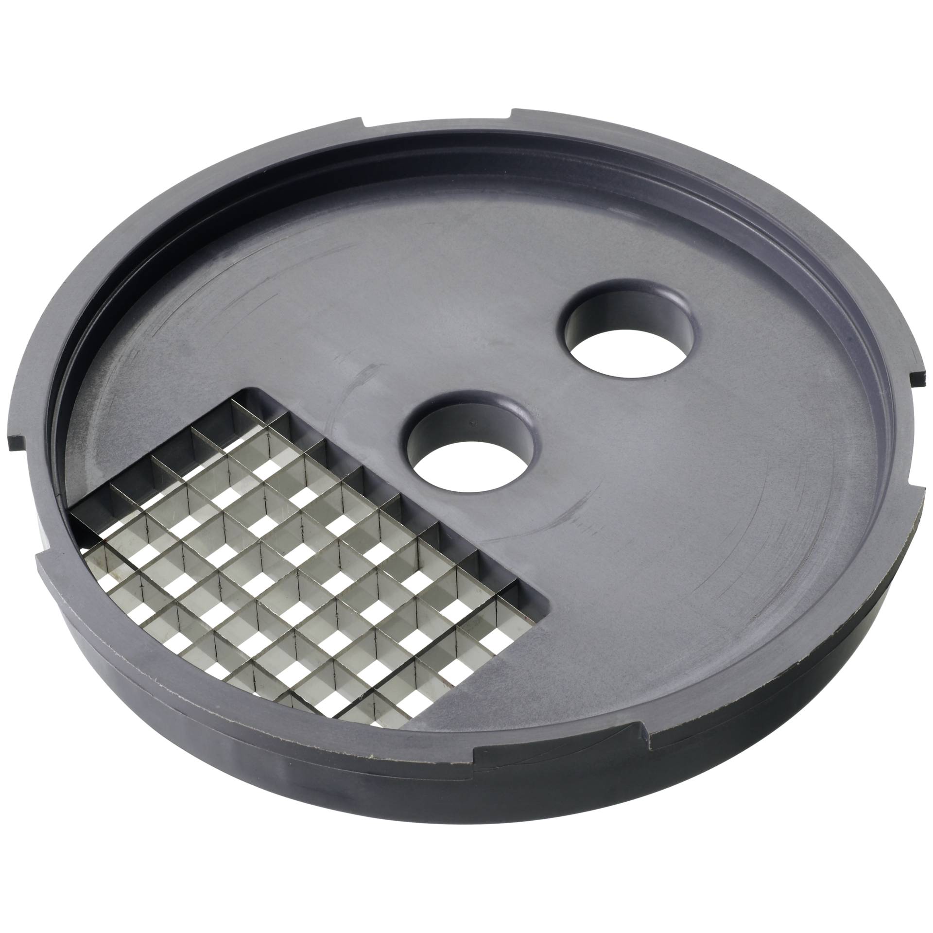 Das KAX400PL Würfelschneide-Zubehör ist ausgestattet mit einer Würfelscheibe aus Edelstahl für 10 x 10 mm große Würfel und einer Schneidscheibe aus Edelstahl.