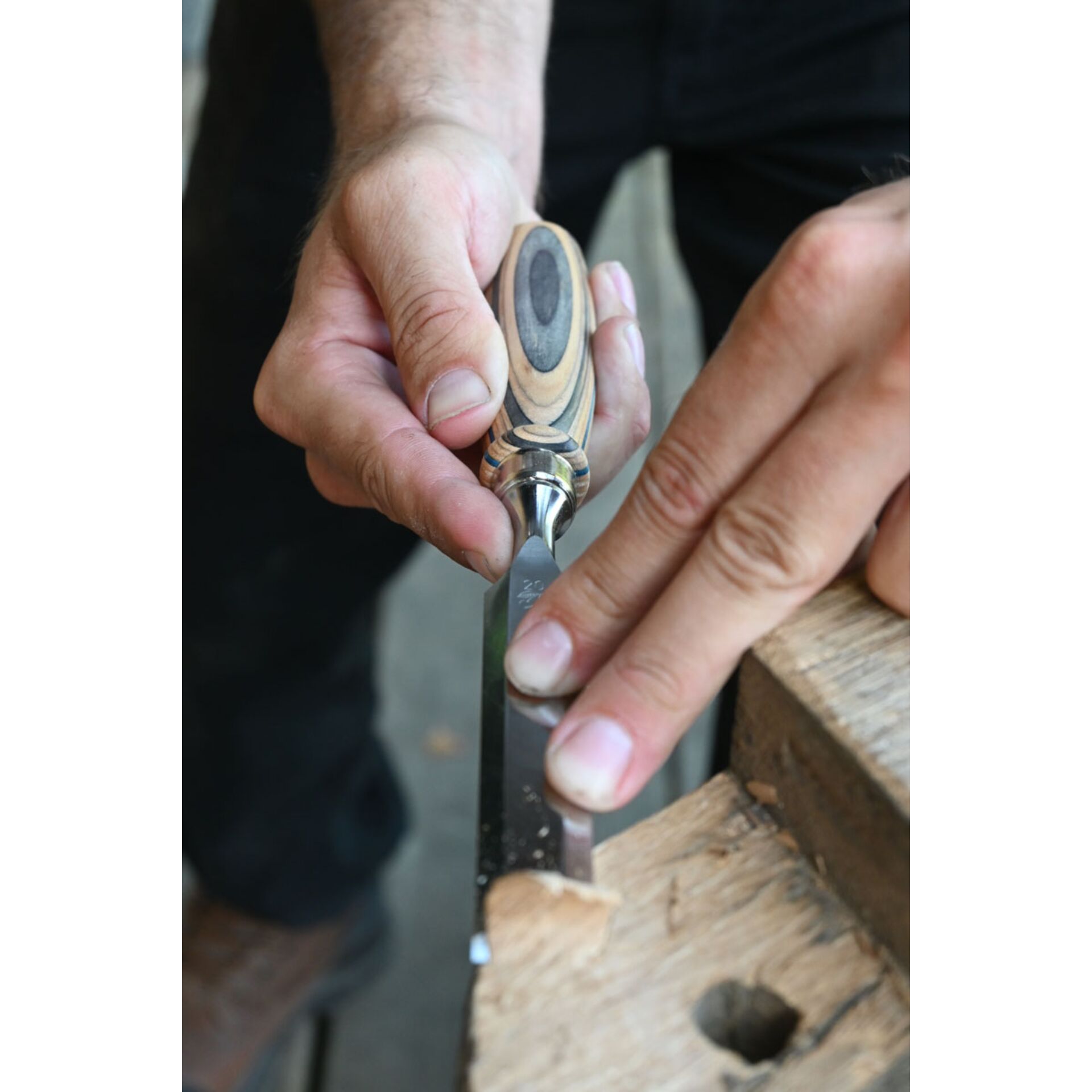Der Stechbeitel mit Skateboardheft kombiniert traditionelle Schmiedekunst mit einem innovativen Griffdesign aus recyceltem Skateboard-Holz. Mit einem Anschliffwinkel von 25° und einer Härte von 61 HRC bietet er präzise Schnitte und lange Standzeit. Dank seiner kompakten Bauweise und dem geringen Gewicht von nur 150 g liegt er leicht und sicher in der Hand.