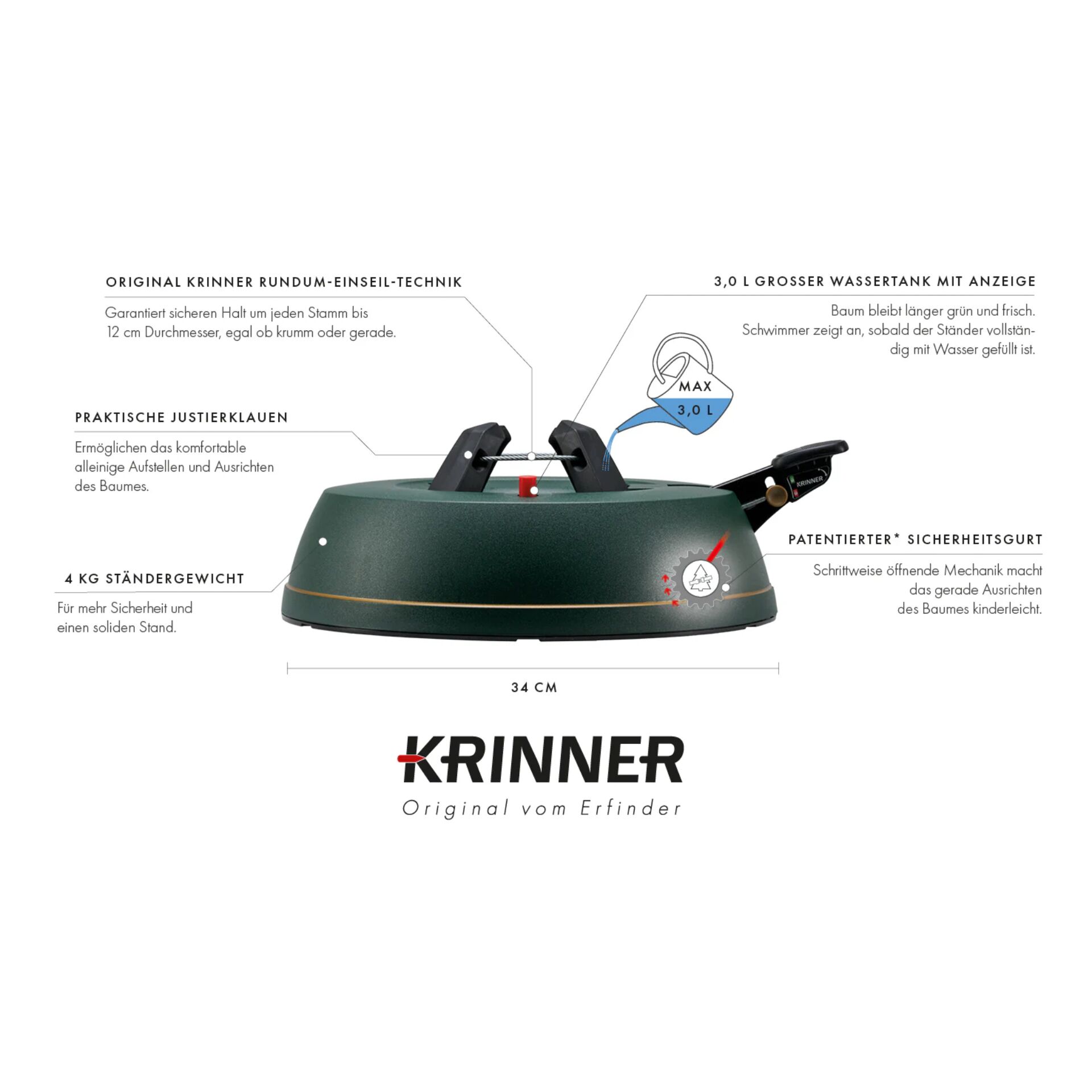 Mit dem Krinner Comfort Grip sicherst du dir einen stabilen Stand für deinen Weihnachtsbaum – ganz ohne Stress. Die Rundum-Einseil-Technik sorgt für festen Halt, während du den Stamm bequem mit dem Fuß fixierst. Der großzügige Wassertank hält deinen Baum länger frisch und die Wasser-Max.-Anzeige hilft dir, den Überblick zu behalten.