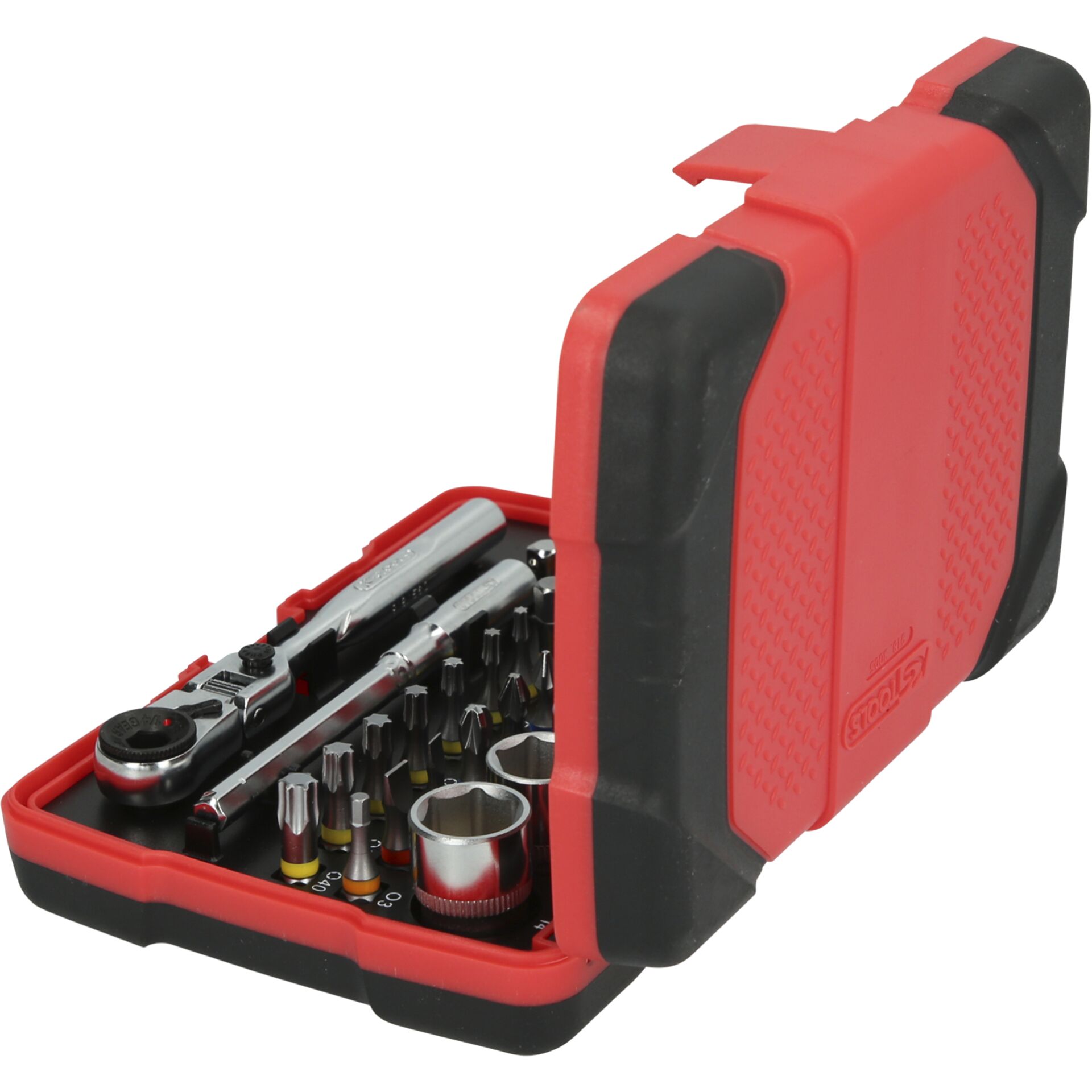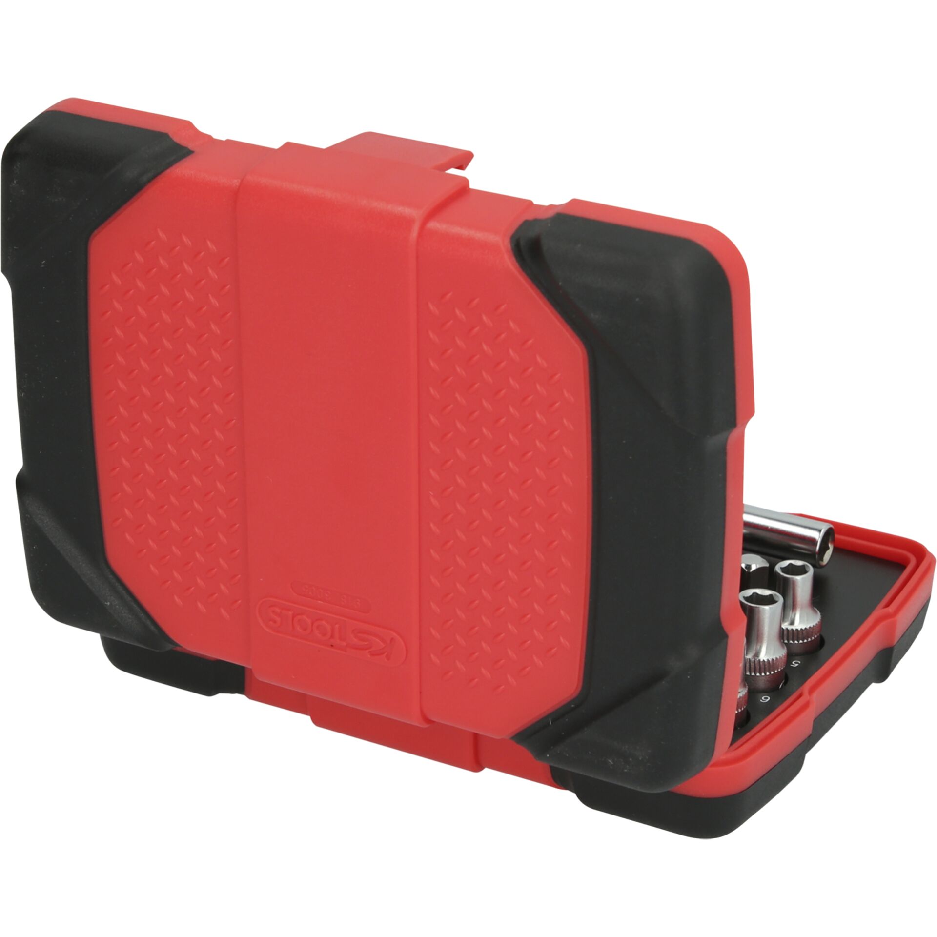 - präzise und ordentliche Anordnung der gängigsten 1/4" Bits und Stecknüsse