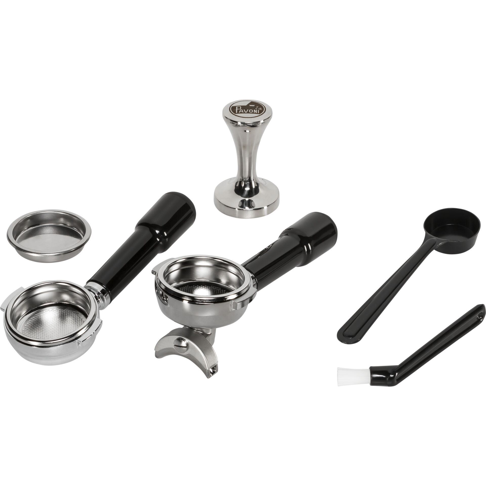 - Zubehör: Filter, Reinigungsbürste, Edelstahl-Tamper und Messbecher