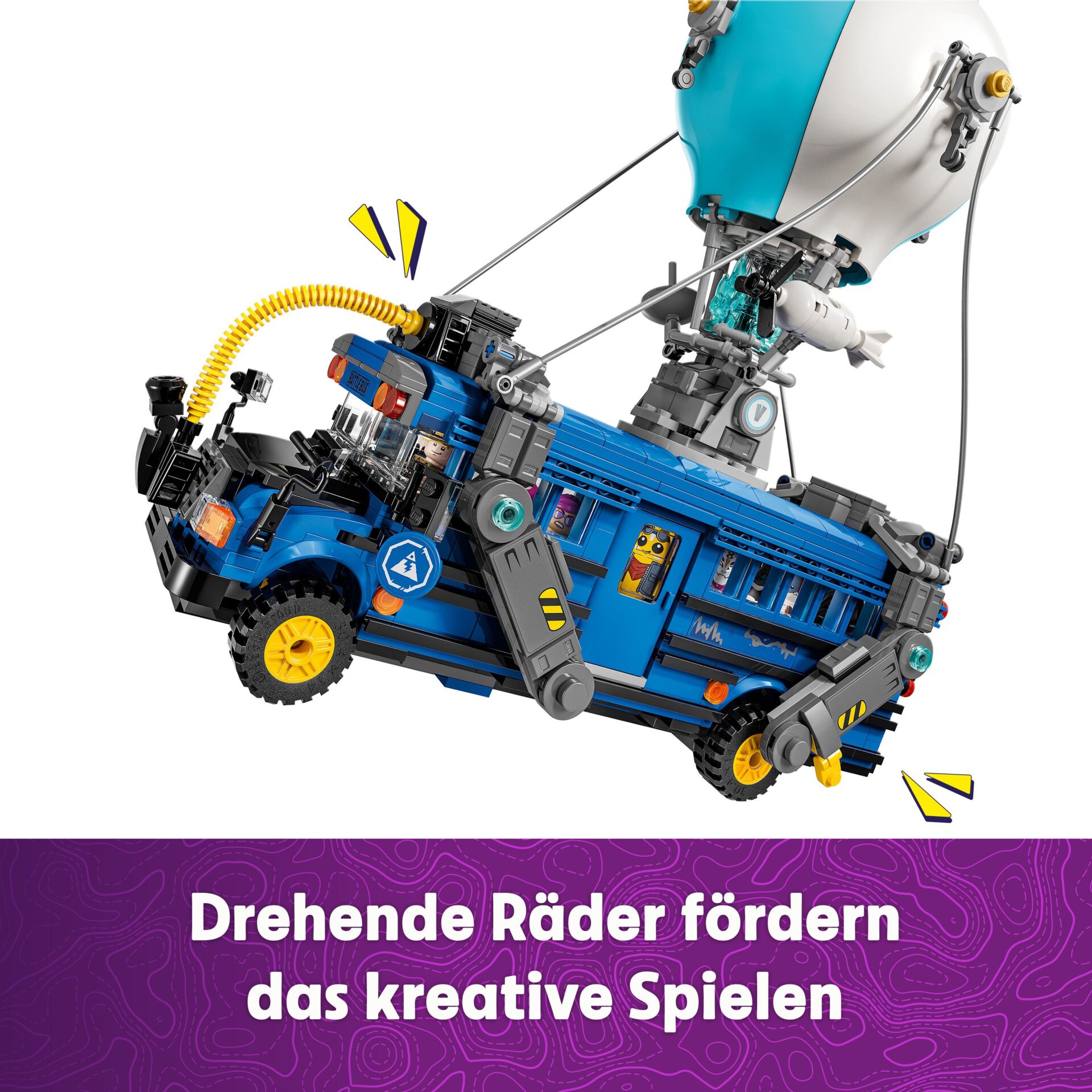 Der LEGO® Schlachtenbus aus der Themenwelt LEGO® Fortnite® bringt das ikonische Fahrzeug aus dem beliebten Videospiel direkt ins Kinderzimmer. Mit seinen drehbaren Rädern, einem abnehmbaren Dach und dem auffälligen Heißluftballon bietet das Modell zahlreiche Details, die Fans des Spiels wiedererkennen. Die Konstruktion orientiert sich an der digitalen Vorlage und sorgt für authentischen Bauspaß.