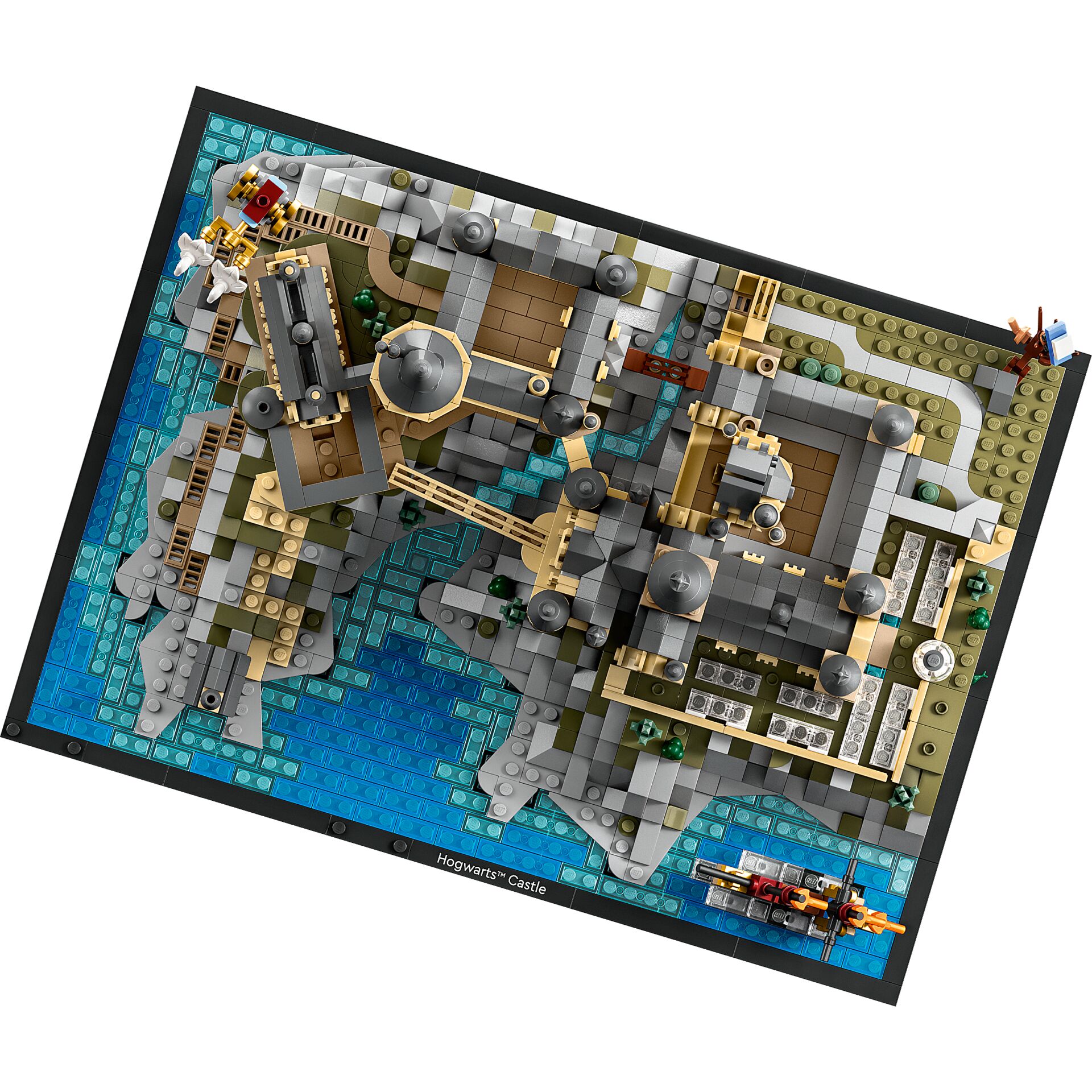 Das Modell Schloss Hogwarts™ mit Schlossgelände zeigt den markanten Schauplatz aus Harry Potter™ mit zahlreichen Bereichen der Umgebung. Der Aufbau umfasst unter anderem Hauptturm, Astronomieturm, Große Halle, Bootshaus, Innenhöfe, Gewächshäuser, Wege, Brücken, Felsformationen und den Großen See. Zusätzlich befindet sich im unteren Bereich der Aufbau der Kammer des Schreckens, der Kammer der geflügelten Schlüssel, des Klassenzimmers für Zaubertränke sowie der Schachbrettkammer.