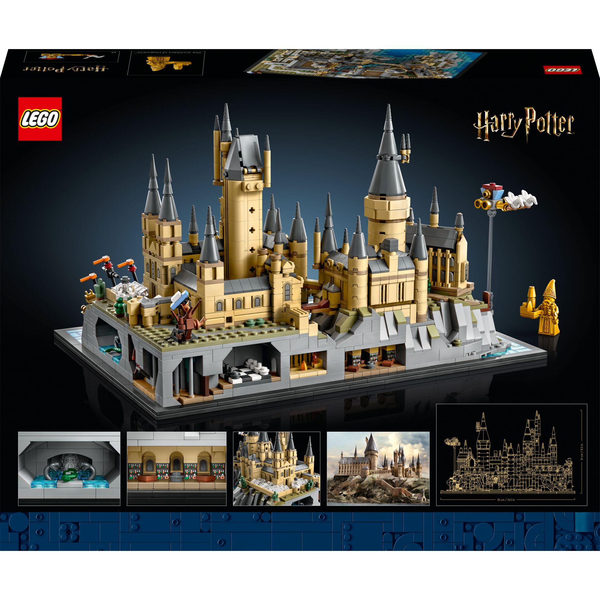 Zum Modell gehören das Durmstrang-Schiff, die Beauxbatons-Kutsche und der Ford Anglia in den Ästen der Peitschenden Weide™. Eine goldene Minifigur des Architekten von Schloss Hogwarts™ sowie eine Tafel mit der Aufschrift Hogwarts Castle ergänzen das Gesamtbild.