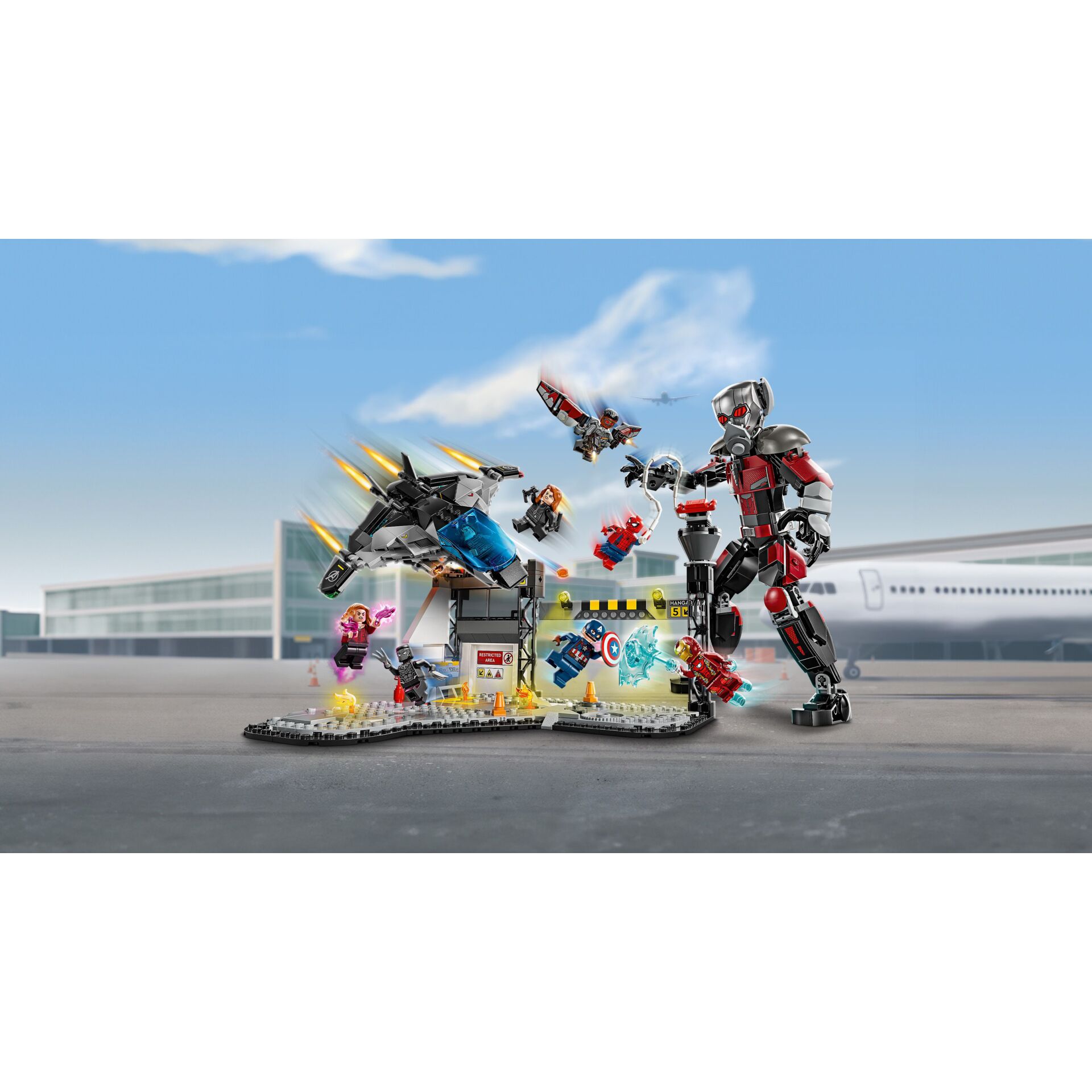 Das Set enthält 8 Minifiguren, darunter Captain America, Winter Soldier, Wanda, Falcon, Iron Man, Spider-Man, Black Widow und Black Panther. Außerdem gibt es eine große, voll bewegliche Ant-Man LEGO® Figur, die über 24 cm groß ist. Der Quinjet mit klappbaren Flügeln und einem aufklappbaren Cockpit bietet Platz für eine Minifigur und sorgt für noch mehr Spielspaß.