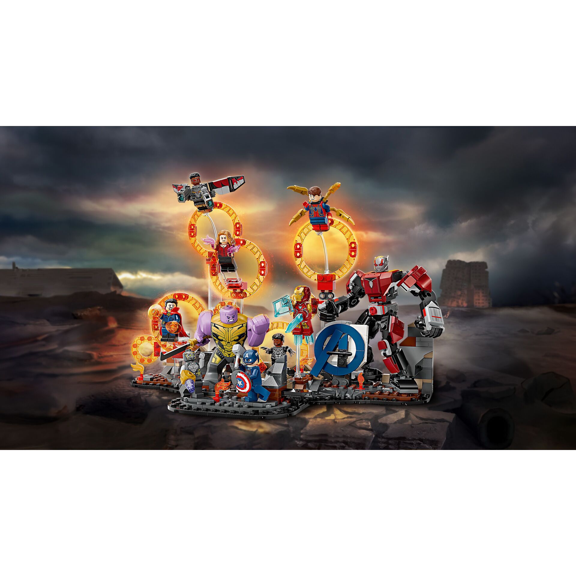 Das Set enthält 9 Minifiguren, darunter Captain America, Iron Man, Black Panther, Scarlet Witch, Ant-Man, Iron Spider, Doctor Strange, Falcon und einen Chitauri-Krieger. Außerdem gibt es eine große Thanos-Figur und einen voll beweglichen Ant-Man Mech. Die verschiedenen Module des Sets lassen sich beliebig umbauen und kombinieren, um endlose Spielmöglichkeiten zu bieten.