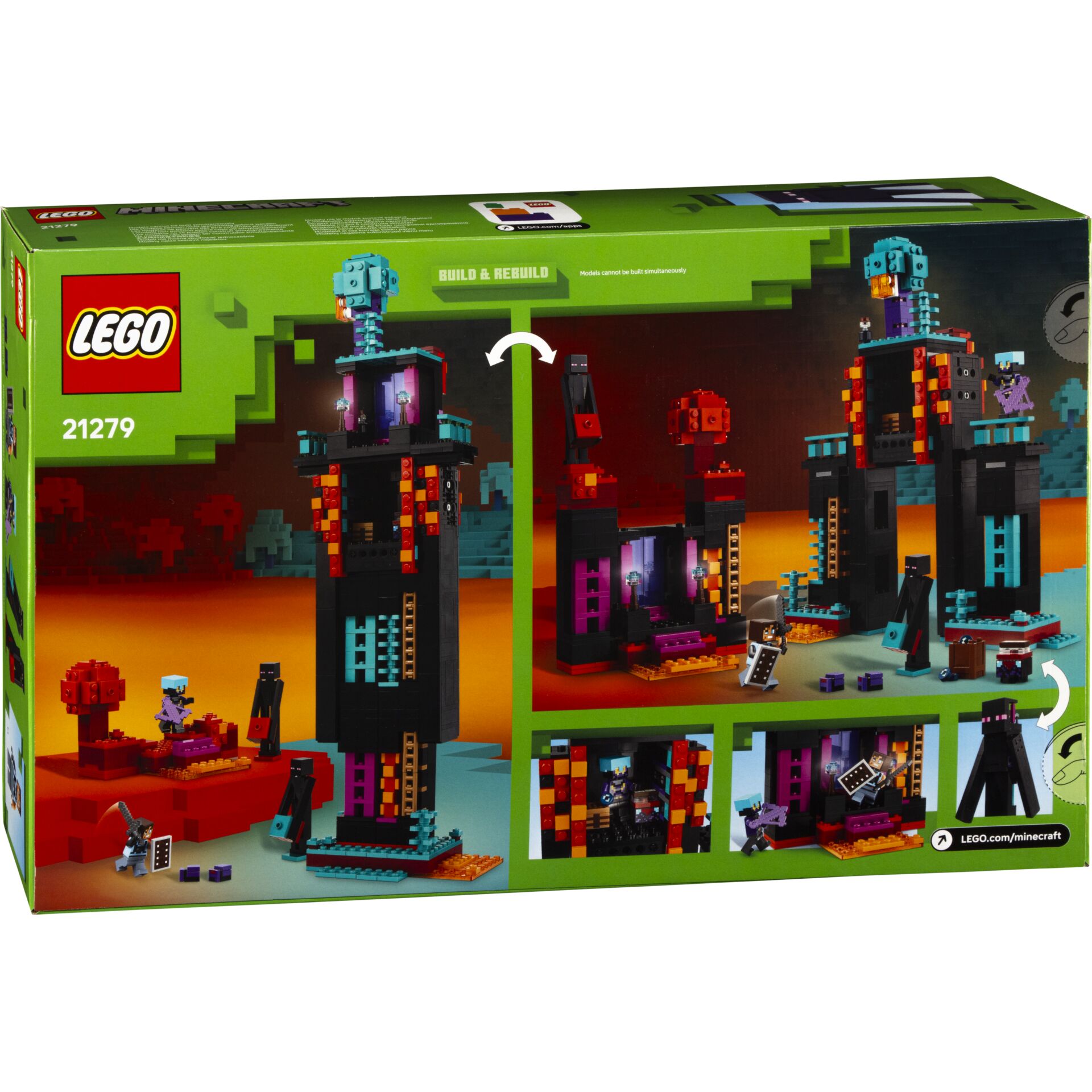 Das LEGO® Minecraft® Set „Der Enderman-Turm“ enthält zwei baubare Modelle: einen modularen Turm in Form eines Endermans sowie ein Nether-Portal im Kopf des Turms. Die Gestaltung orientiert sich an der bekannten Minecraft®-Welt und enthält mehrere Spielfiguren für Rollenspiele.