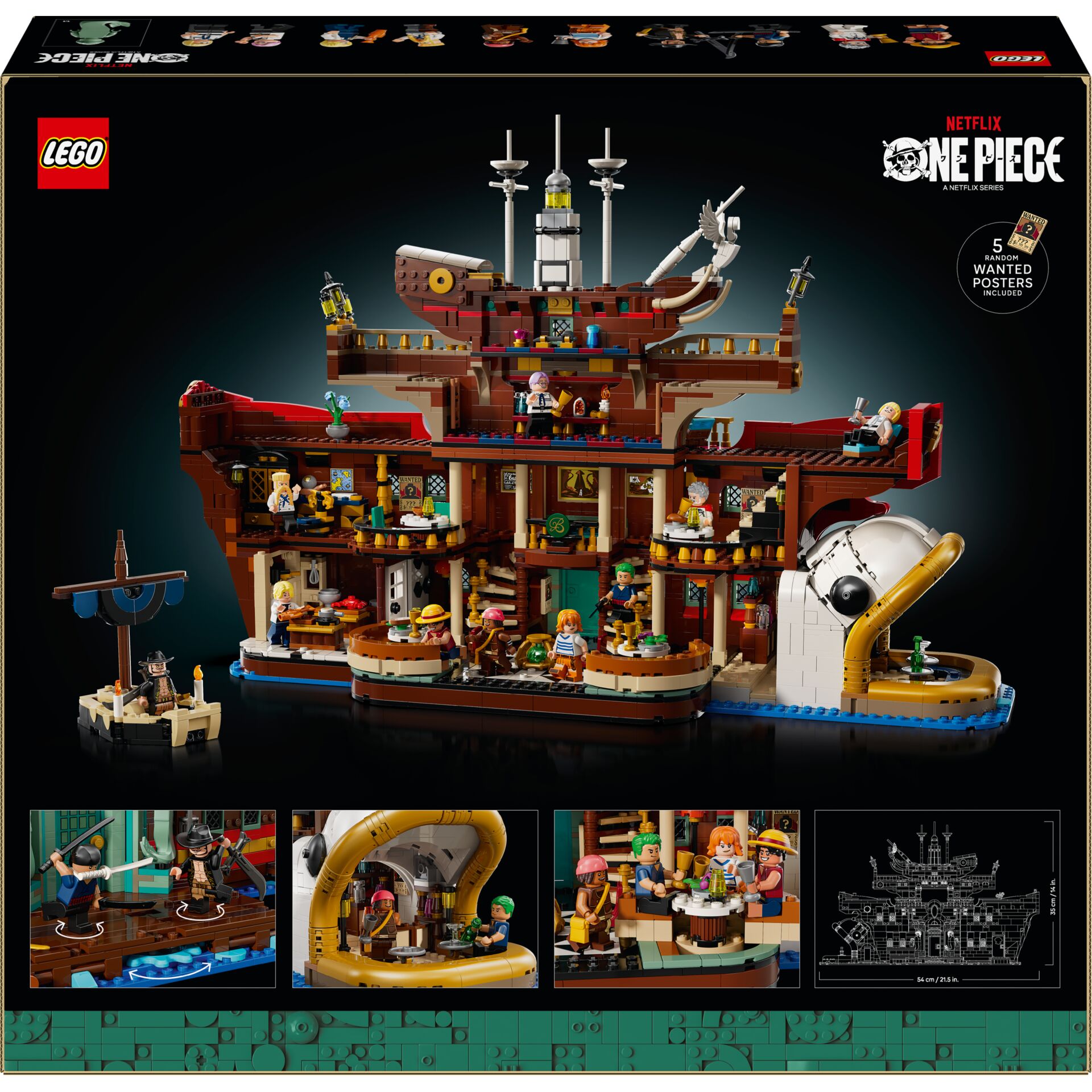 Im Inneren offenbart das Modell ein reich ausgestattetes Interieur mit mehreren zugänglichen Bereichen, darunter ein Speisesaal, eine Küche, private Quartiere (unter anderem Zeffs Quartier) und sogar eine Schatzkammer. Diese Räume ermöglichen detailreiche Nachstellungen aus der One Piece-Serie oder eigene Szenarien rund um das dramatische Leben der Piraten und Köche.