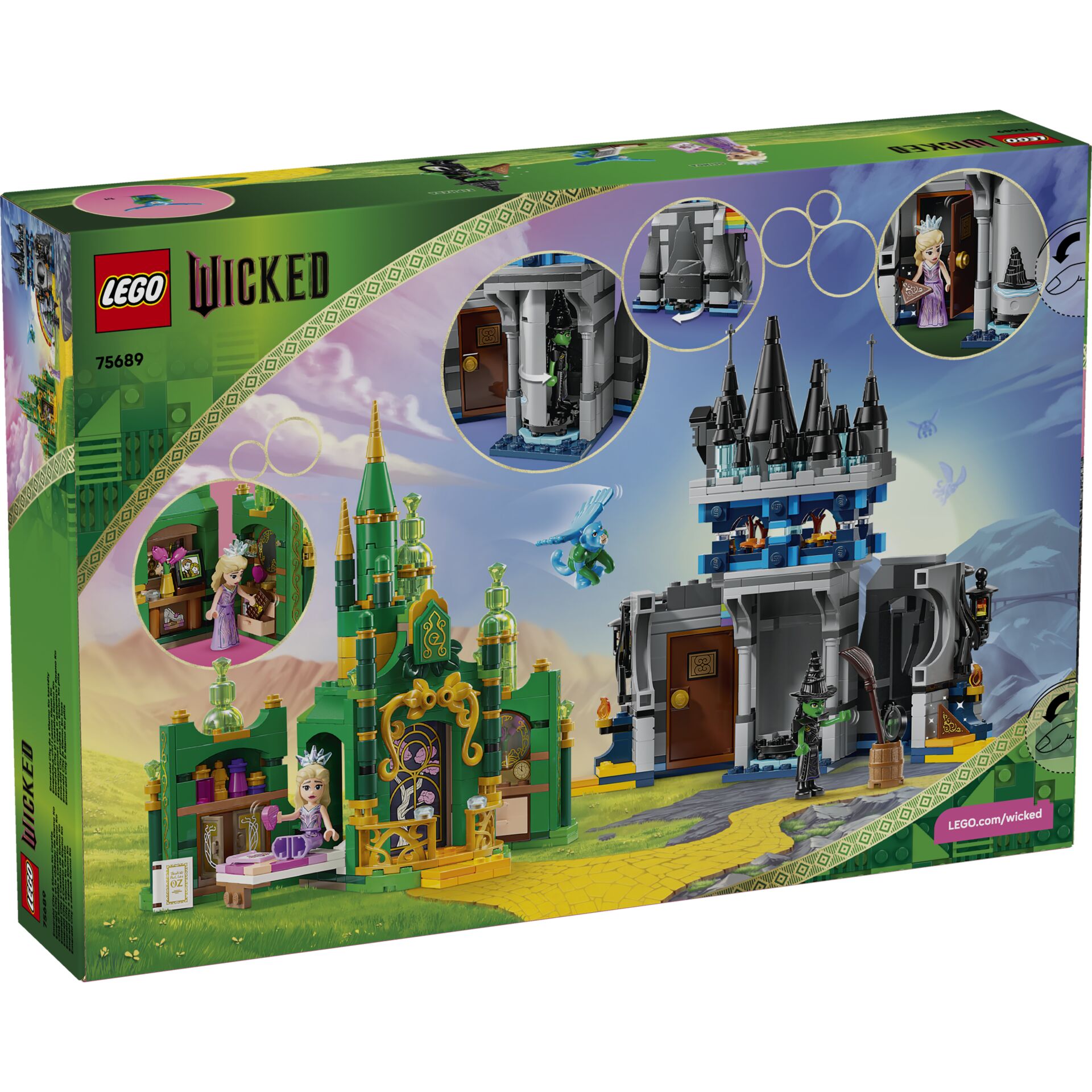 Das Set enthält zwei detaillierte Modelle: Emerald City und Kiamo Ko Castle. Mit dabei sind die Minifiguren von Elphaba und Glinda sowie die erste LEGO® fliegende Affenfigur. Die detailreichen Schauplätze bieten zahlreiche versteckte Überraschungen und authentische Details aus den Filmen.