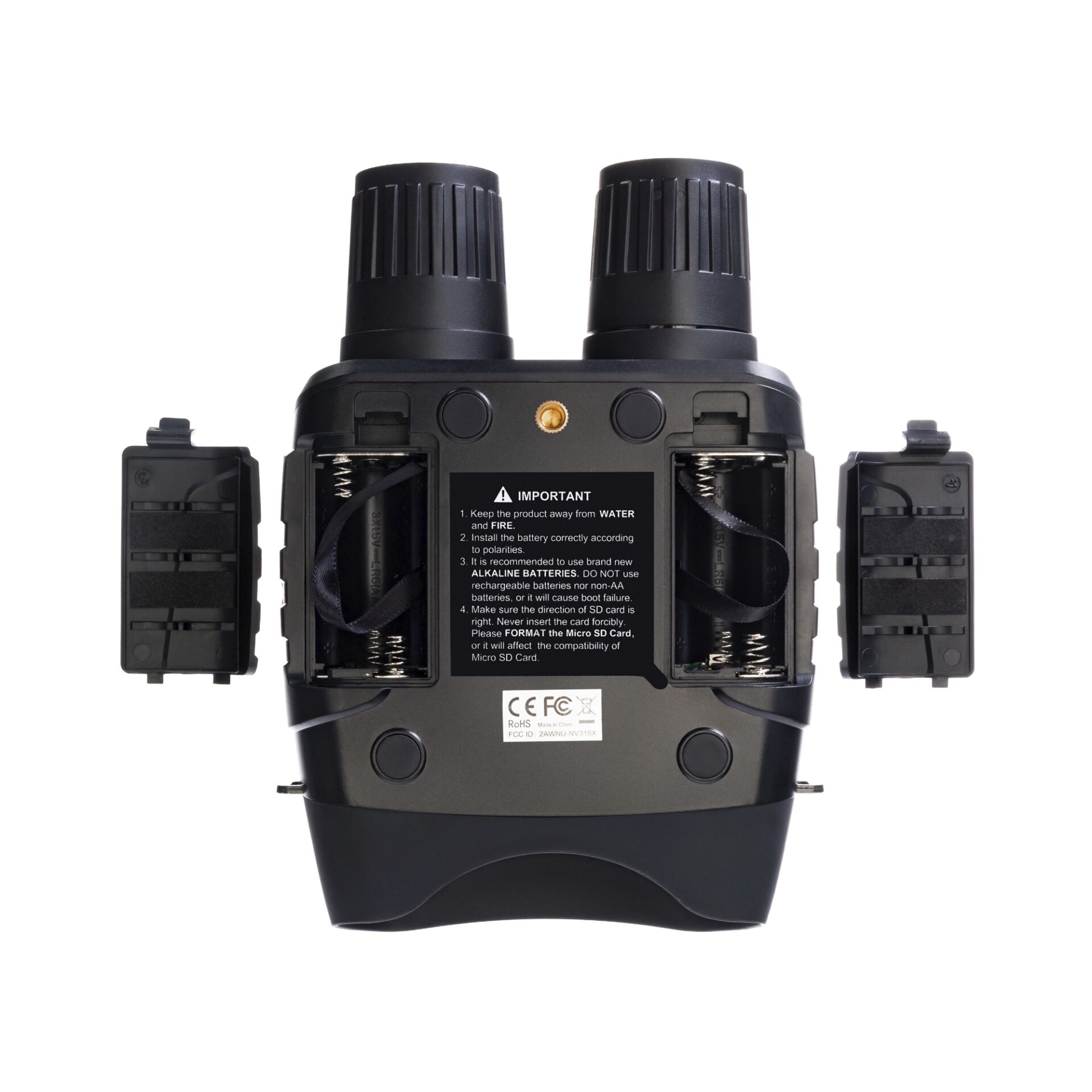 Das Fernglas ist mit einem ergonomischen, tropfwasserdichten Gehäuse mit rutschfreier Oberfläche ausgestattet. Dadurch liegt das Fernglas bequem in der Hand. Wenn Sie es ergreifen, befinden sich die Bedientasten direkt unter Ihren Fingern. Das Gerät wird mit handelsüblichen Standardbatterien betrieben, und unter Feldbedingungen ist es viel einfacher, einen Satz Batterien zu ersetzen, als eine Steckdose zum Aufladen zu suchen. Ein Satz reicht für ca. 4—10 Stunden Dauerbetrieb; die Dauer der Batterielaufzeit hängt davon ab, wie intensiv die IR-Beleuchtung genutzt wird.