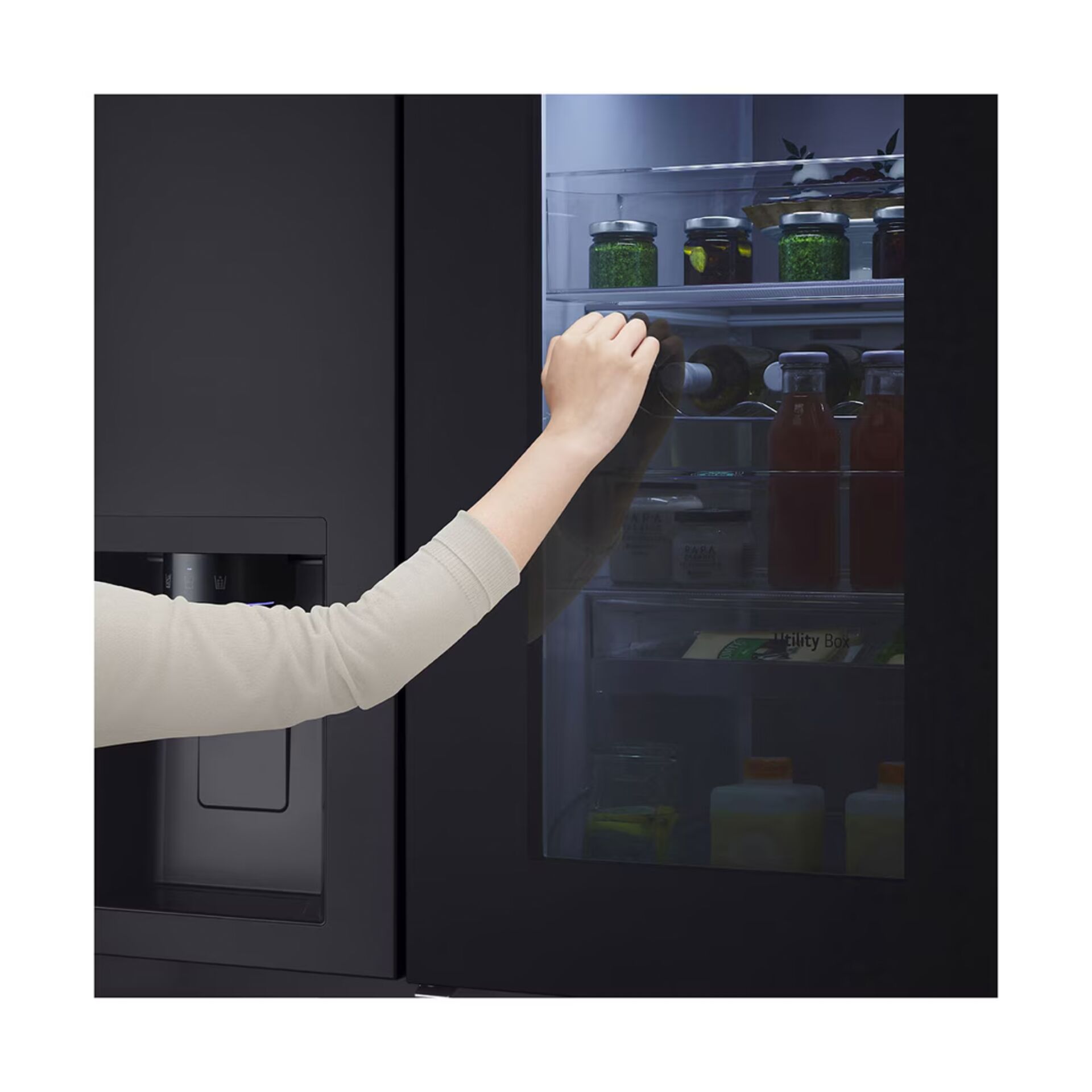 Der LG GSXE90EVAD ist ein moderner Side‑by‑Side‑Kühlschrank aus der InstaView‑Reihe und kombiniert ein elegantes Dark‑Inox‑Design mit praktischen Funktionen für den Alltag. Die charakteristische InstaView‑Door‑in‑Door‑Front ermöglicht einen schnellen Blick ins Innere, ohne die Tür öffnen zu müssen. Ein einfaches Klopfen genügt, um das transparente Fenster zu aktivieren – das spart Energie und erleichtert den Zugriff auf häufig benötigte Lebensmittel.