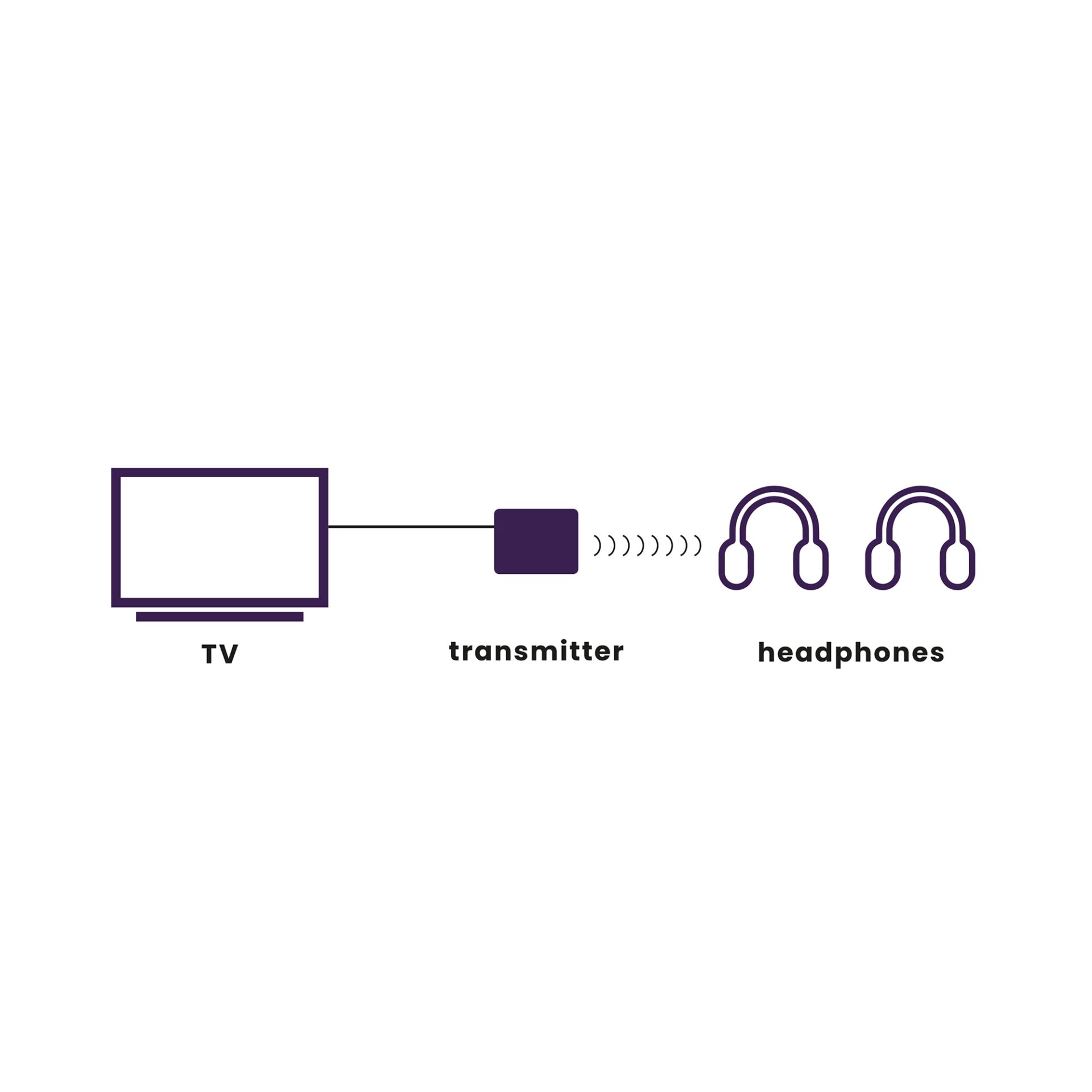 - Überträgt TV-Ton kabellos an bis zu zwei Kopfhörer