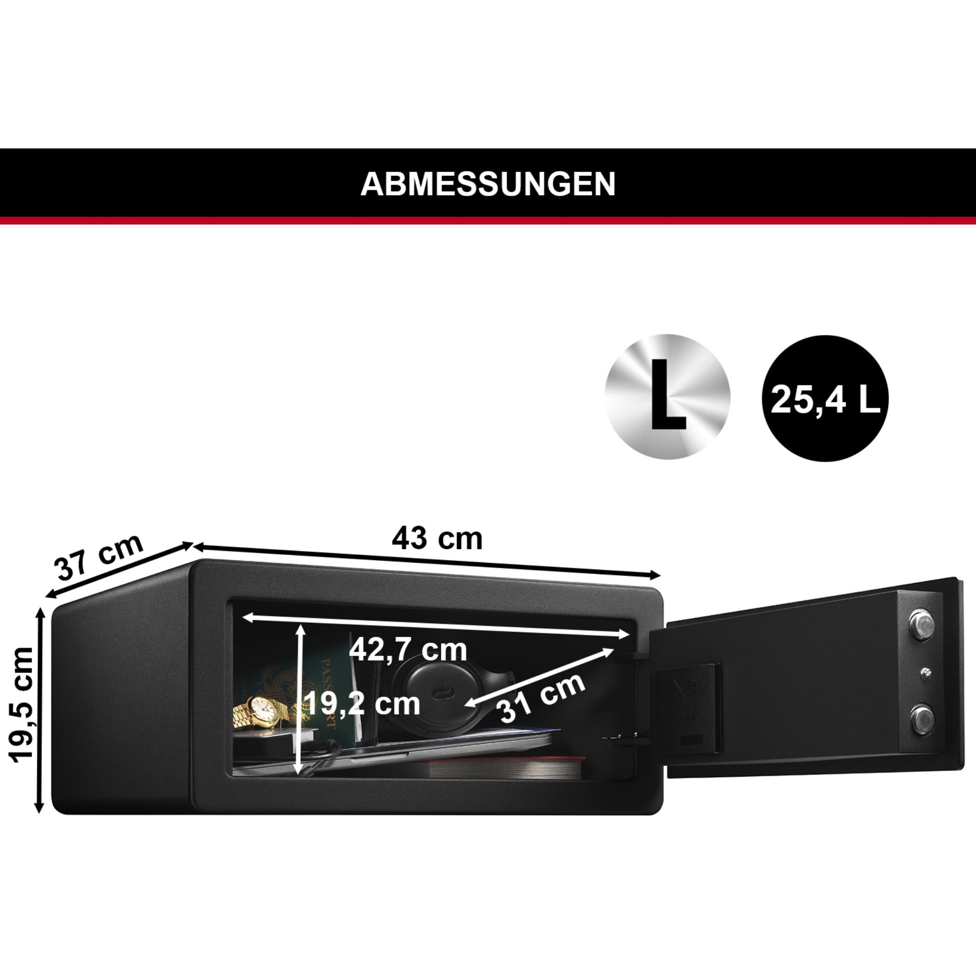 Dieser Sicherheitssafe ist geeignet für A4-Dokumente, Laptops, Kleinelektrogeräte, Scheckbücher oder Pässe.