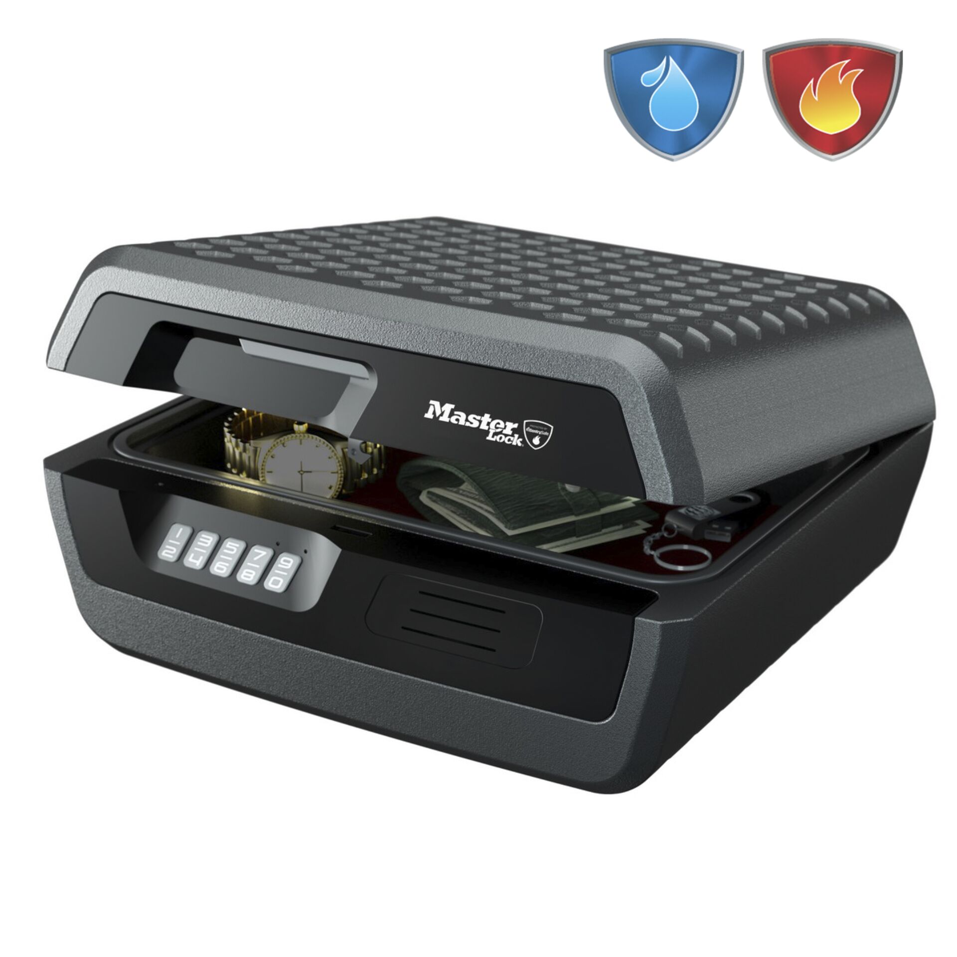 - Das digitale Schloss schützt Dokumente und Wertsachen vor neugierigen Blicken und verhindert, dass sich der Deckel im Brandfall öffnet