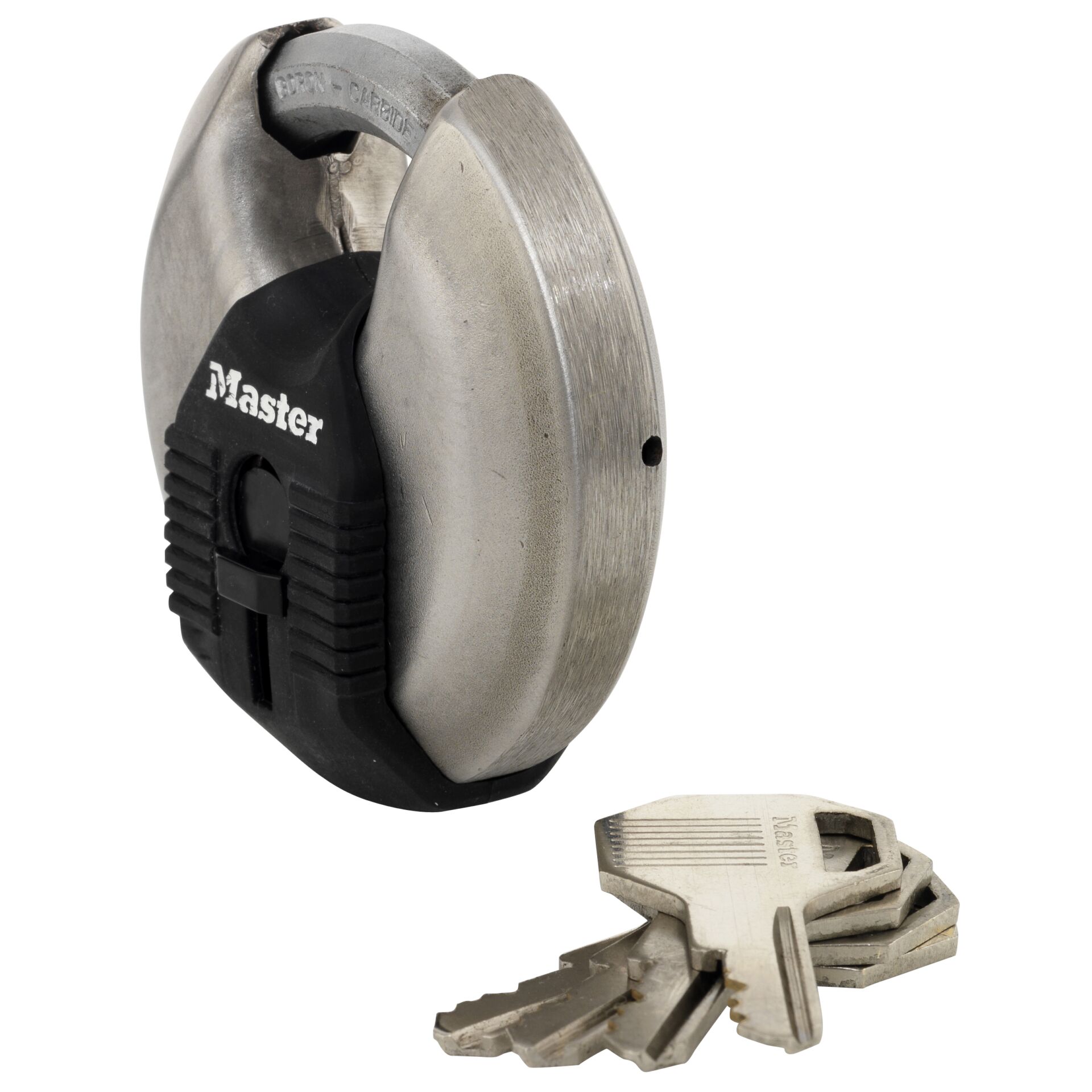 Das Master Lock Disc Schloss M40EURD mit 70 mm breitem Edelstahlgehäuse ist besonders massiv, zuverlässig und korrosionsbeständig. Das verdeckte Design minimiert die Sichtbarkeit des Bügels und schützt vor Aufbruchsversuchen mit dem Bolzenschneider. Der achteckige Bügel mit einem Durchmesser von 10 mm ist 16 mm lang und aus Tough-Cut Borcarbid gefertigt, das 50 % härter als gehärteter Stahl ist und maximalen Widerstand gegen Schneiden und Sägen bietet. Der Schließzylinder mit 4 Stiften verhindert das Aufknacken des Schlosses, während die beiden Kugellagerverriegelungen davor schützen, dass das Schloss aufgebrochen oder zerschlagen wird. Die Schlüsselkanalabdeckung bietet besten Witterungsschutz und die verstärkte Stoßschutzleiste schützt vor Kratzern.