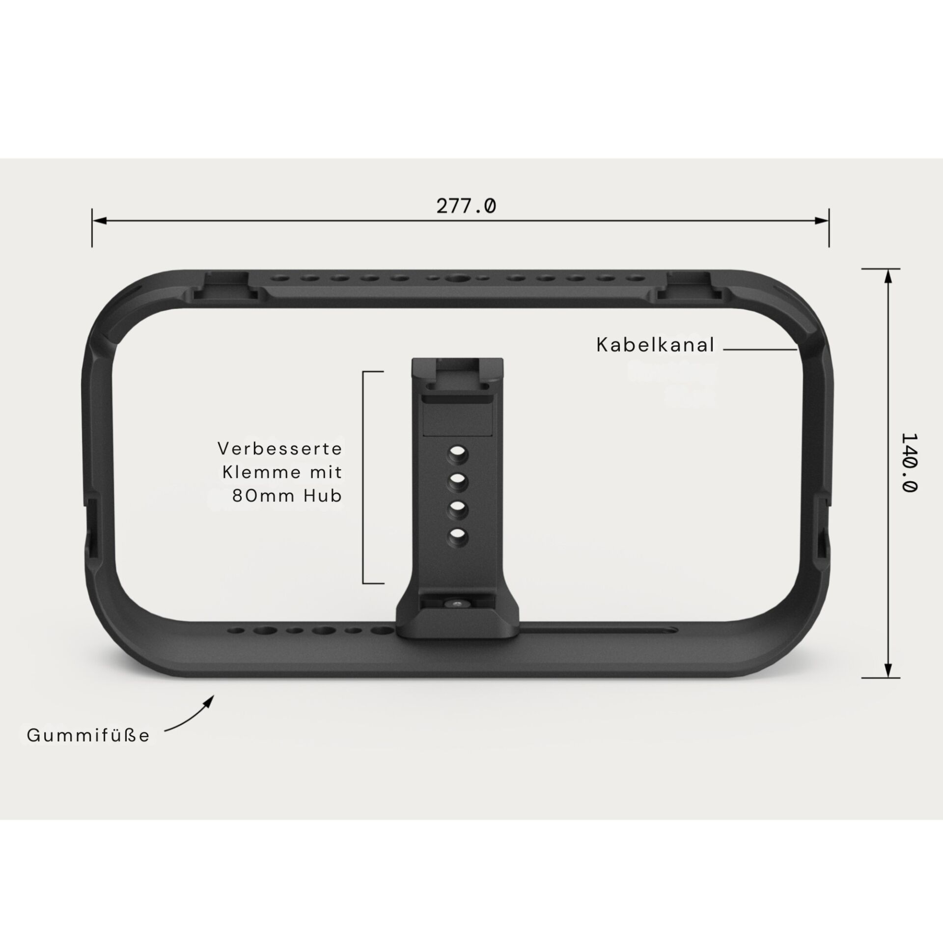 Gefertigt aus gegossenem Aluminium, kombiniert das BaseCage eine flache, stabile Konstruktion mit hoher Alltagstauglichkeit. Die offene Bauweise erleichtert den schnellen Zugriff auf Bedienelemente und Anschlüsse des Smartphones. Kabeldurchführungen an den oberen Ecken unterstützen eine aufgeräumte Kabelführung und reduzieren störende Kabel beim Filmen oder Fotografieren. Die Befestigung für das Smartphone über eine mechanische Klemme erlaubt eine Anpassung an unterschiedliche Anforderungen und Arbeitsweisen.