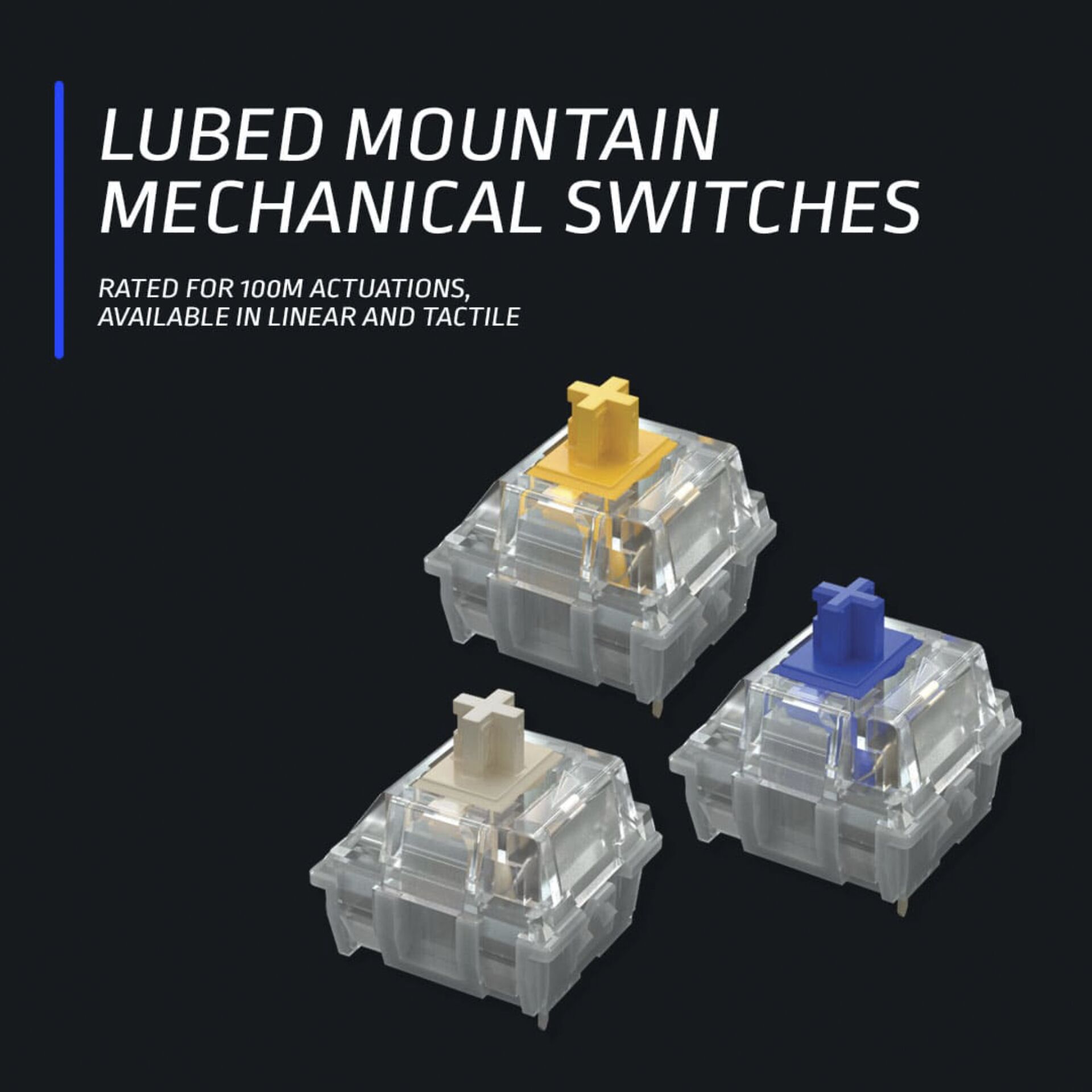 Die maßgeschneiderten MOUNTAIN Linear 45-Schalter wurden für einen reibungslosen und leisen Betrieb entwickelt und sind daher ideal für Gamer und Profis gleichermaßen. Werkseitig geschmiert sind diese Schalter ein Genuss für Augen und Ohren. Everest 60 akzeptiert gerne alle anderen 3-poligen plattenmontierten oder 5-poligen leiterplattenmontierten Schalter.