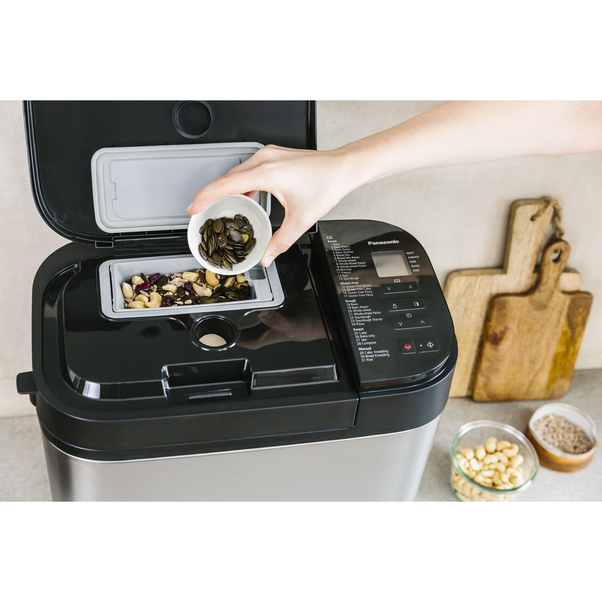 Lassen Sie Ihrer Kreativität freien Lauf und zaubern Sie leckere Brote, ebenso wie Kuchen, hausgemachte Pizza, Marmeladen und vieles mehr. Mit dem Brotbackautomaten YR2550 von Panasonic haben Sie einen Küchenhelfer, der auf über drei Jahrzehnten Erfahrung und Kompetenz basiert. Eine ganze Reihe perfekt abgestimmter Funktionen sorgen dafür, dass Sie Ihr Wunschbrot backen können – und das stets in höchster Qualität.