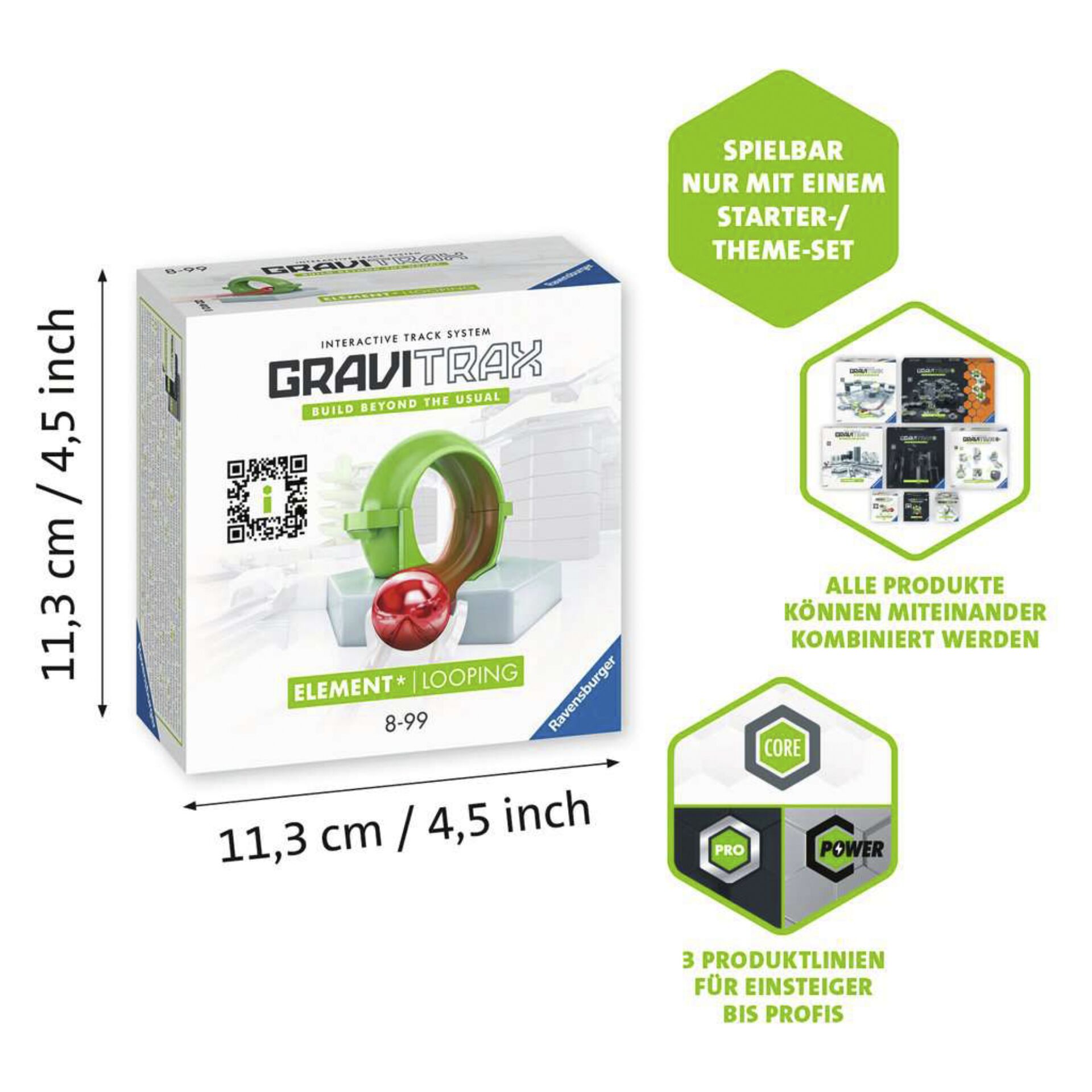 Das GraviTrax Element Looping bringt richtig Schwung auf deine Kugelbahn! Wie schnell müssen die Kugeln rollen, um die Schwerkraft zu überwinden? Die Kugeln sausen mit hoher Geschwindigkeit durch das Looping. Wenn du das Looping mit einem GraviTrax Starter-Set kombinierst, wird deine Kugelbahn noch lebendiger.