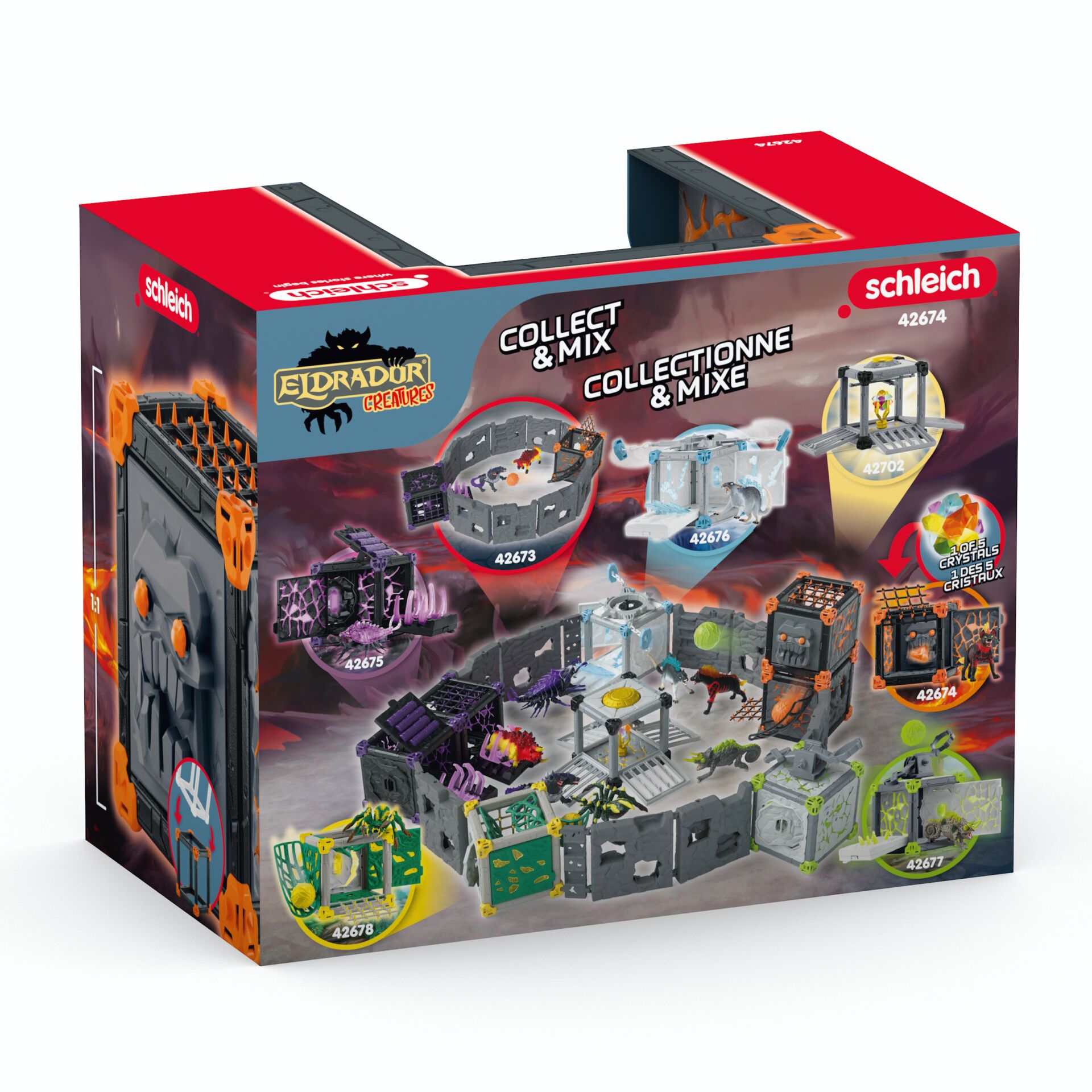 Mit glühenden Augen baut sich die Lavahyäne drohend vor ihrem BattleCave auf. Wer wagt es, mit ihr den Kampf aufzunehmen? Sie verteidigt den Weltenkristall, der im BattleCave lagert. Im Cave ist ein fieses Gesicht zu sehen, in dessen Mund der Kristall liegt. Gruselig – die Augen sind ja Pfeile! Wer es wagt, den BattleCave zu erklimmen, muss vorsichtig sein, denn die Gitterstäbe öffnen sich leicht zu einer hinterhältigen Falle. Einmal im BattleCave gefangen, lässt einen die Lavahyäne sicher nicht so schnell wieder laufen … Die ELDRADOR® CREATURES BattleCaves verwandeln jedes Kinderzimmer in eine Actionzone! Wer stellt sich dem atemberaubenden Kampf? Alle BattleCaves können kombiniert werden. So lauern finstere Tunnel, und gemeine Fallen auf die Angreifer. In der großen Arena treffen sie zum Duell aufeinander. Was für ein Kampf!