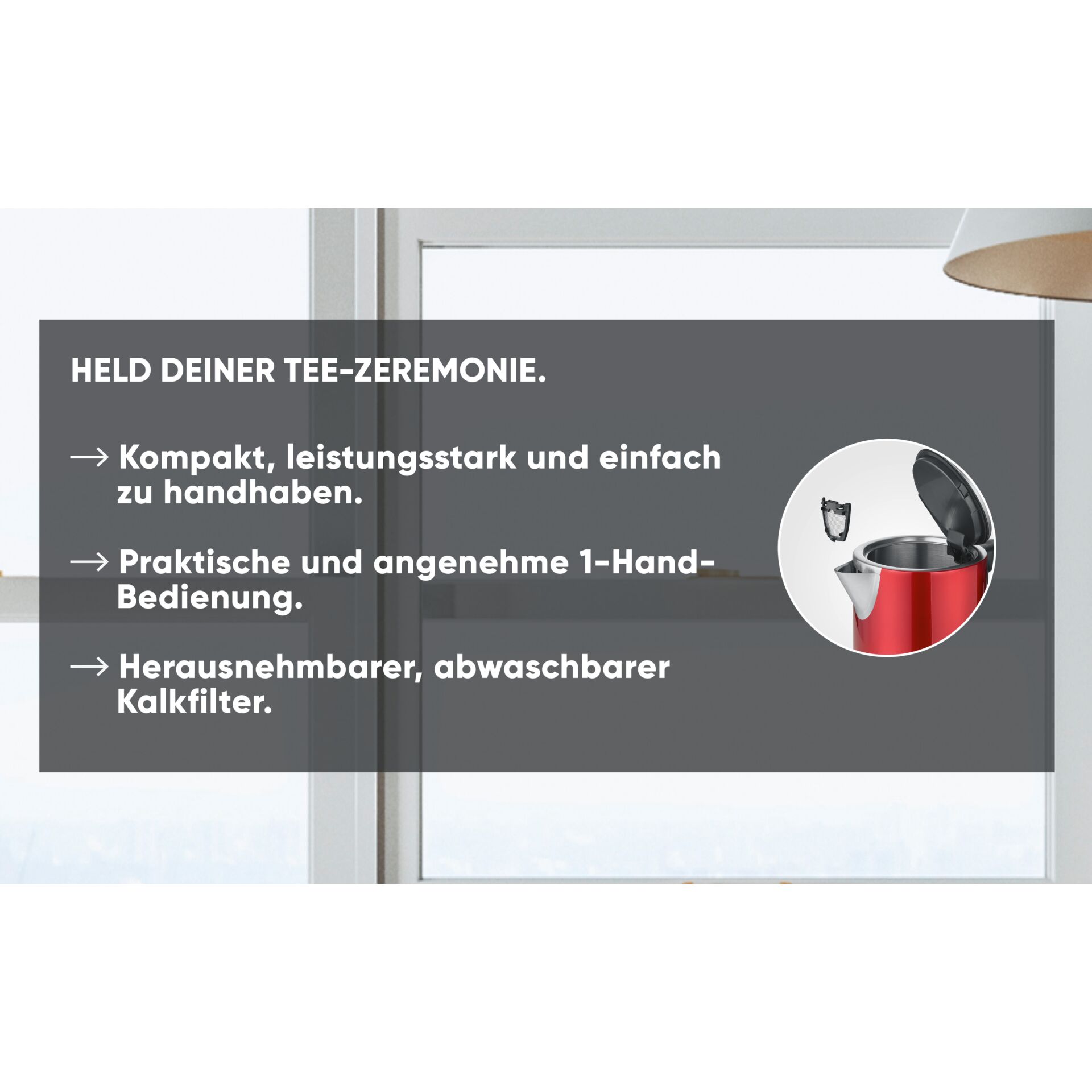 Ob zum Aufgießen von Tee und Instantgerichten, oder für die Zubereitung von Babynahrung – mit dem modernen Edelstahl-Wasserkocher dauert das Aufkochen von Wasser nur wenige Minuten. Zum Befüllen und Ausgießen wird das schnurlose Gehäuse einfach von der 360°-Station entnommen.