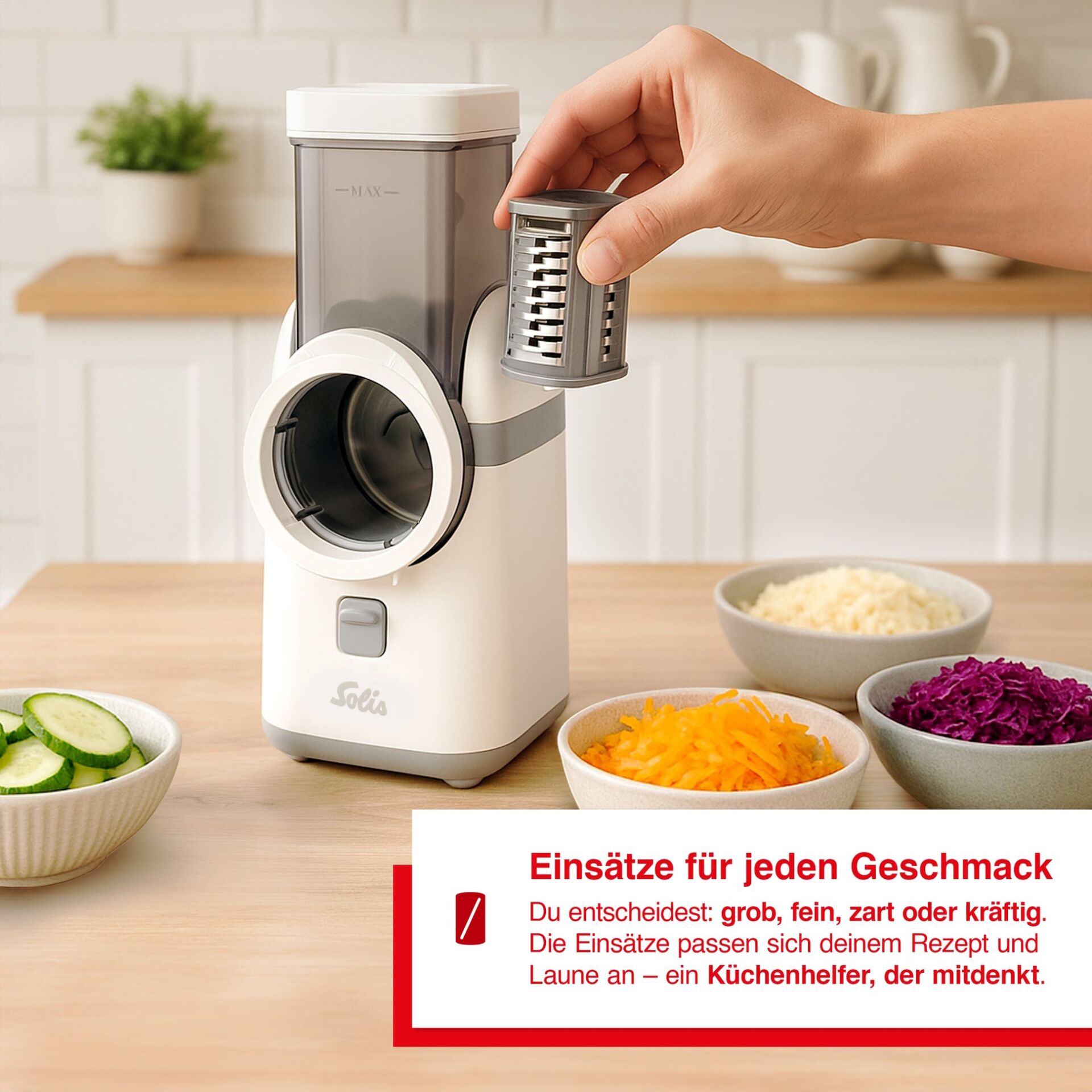 Fünf auswechselbare Einsätze ermöglichen dir verschiedene Schnittarten – vom feinen Raspeln bis zu Julienne-Streifen. Die schmale Öffnung unterstützt dich beim präzisen Schneiden langer Lebensmittel, während die große Öffnung auch größere Stücke aufnimmt. Die Sicherheitsstopp-Funktion sorgt dafür, dass du sicher arbeiten kannst.