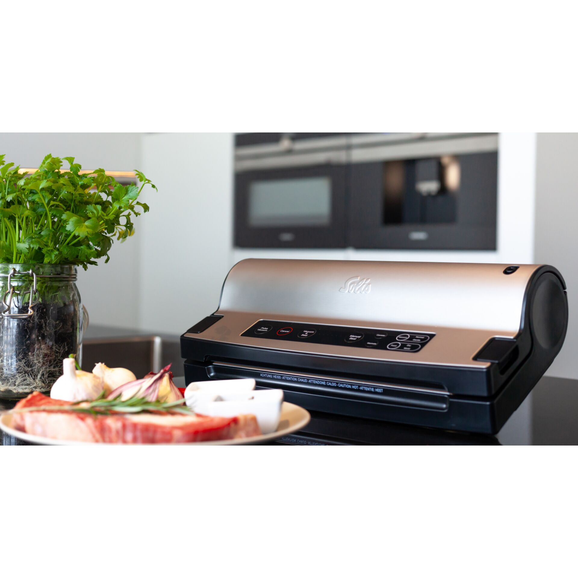 Mit der voll ausgestatteten Solis Vac Prestige Vakuummaschine können Sie Lebensmittel bis zu 8 Mal länger frisch halten. Das Gerät bietet Funktionen wie das Marinieren und Sous-Vide-Garen von Lebensmitteln. Es ist für alle Arten von Lebensmitteln geeignet und verfügt über einen Folienschneider.