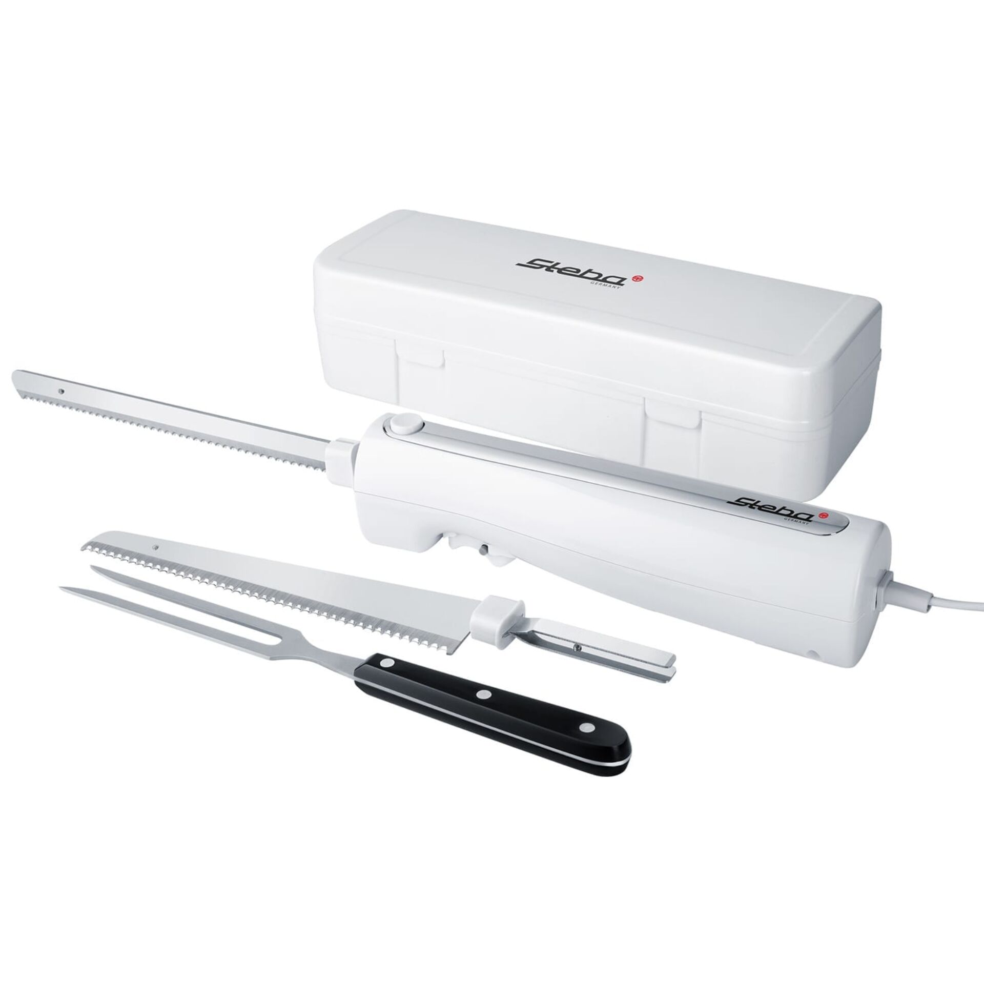Mit dem leistungsstarken Elektromesser-Set EM 3 von Steba sitzt jeder Schnitt perfekt. Die leicht austauschbare Edelstahlklinge mit robustem Wellenschliff gleitet optimal durch jeden Braten. Mit dem im Lieferumfang enthaltenen Brotmesser kann sogar Brot einfach geschnitten werden. Mit der Fleischgabel aus Edelstahl haben Sie den Braten immer im Griff und können ihn gleich nach getaner Arbeit servieren. Der ergonomisch geformte Handgriff des EM 3 macht die Handhabung und den Bedienkomfort perfekt.